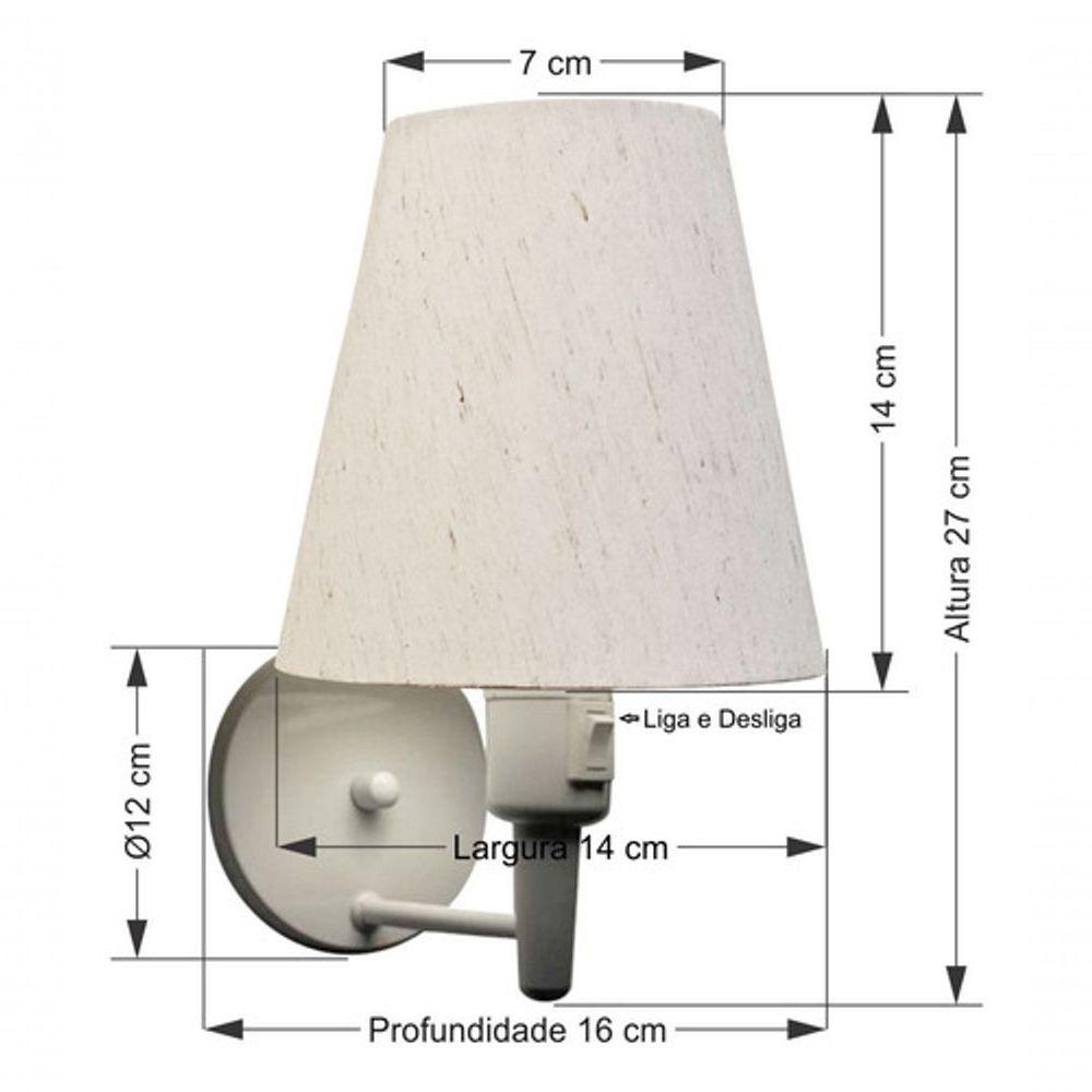Arandela Cone Md-2013 Branco C/ Inter Liga E Desl Cúpula Em Tecido Linho Bege - BivoltArandela de parede Cone Md-2013 Branca C/ Inter Liga e Desl Cúpula Tecido Linho BegeAs arandelas Lustres Vivare são elementos versáteis e elegantes que podem transformar qualquer ambiente em um espaço cheio de estilo. Seja para adicionar uma iluminação suave, destacar uma parede ou criar um efeito de luz diferenciado.Dimensão:Cúpula em Tecido: 14x07x14cmArandela de parede Montada: Altura 27cm Largura 14cm Profundidade 16cmFormato: ConeTamanho: PequenoEspecificação:Material: Cúpula em TecidoEstrutura em AlumínioBase Parede: Diâmetro 11x1,2cmResistente: Á MaresiaVoltagem: 110V/220VLiga e Desliga: Interruptor no SoqueteTipo de Soquete: E27Tipo de Lâmpada: Led Bulbo até 16w ou Fluorescente Espiral até 25w CadaCapacidade de Lâmpadas: 1Observação:Acompanha Lâmpada: NãoPossui Led Integrado: NãoGarantia: 12 MesesManual de Instalação: SimArandela de parede Montada: SimControle de Luminosidade: NãoTipo de Embalagem: CaixaConservação e Manutenção do Produto:A Limpeza deve ser realizada com o produto desligado. Remova o lustre que pode ser lavado com sabão neutro. Nunca utilize produtos químicos e abrasivosAntes de comprar o seu produto verifique as medidas, o local onde pretende instalar e se necessário o serviço de um profissional qualificado.