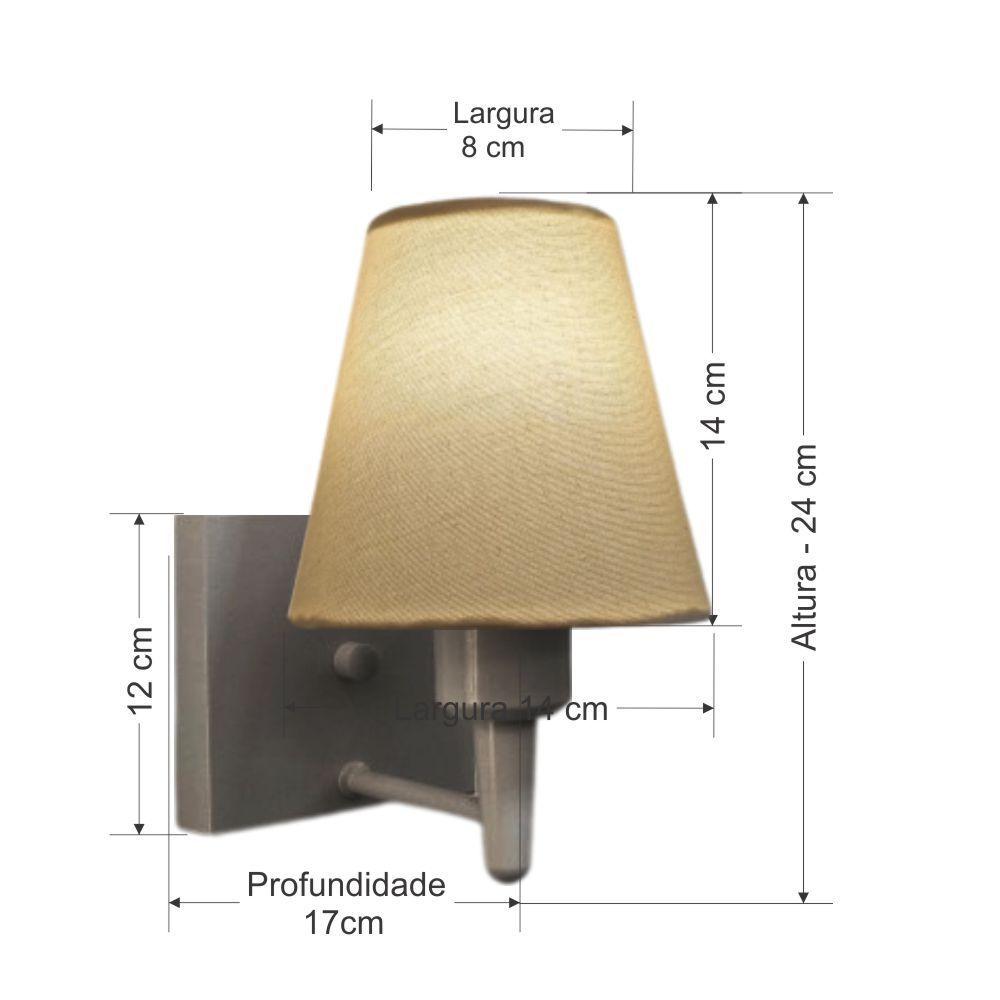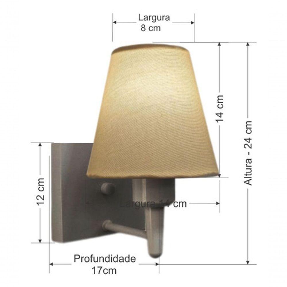 Arandela Quadrada Md-2034 Cinza Cúpula Em Tecido Cone Algodão Crú - BivoltArandela de parede Quadrada Md-2034 Cinza Cúpula em Tecido Cone Algodão Crú - BivoltAs arandelas Lustres Vivare são elementos versáteis e elegantes que podem transformar qualquer ambiente em um espaço cheio de estilo. Seja para adicionar uma iluminação suave, destacar uma parede ou criar um efeito de luz diferenciado.Dimensão:Cúpula em Tecido: 14x07x14cmArandela de parede Montada: Altura 24cm Largura 14cm Profundidade 17cmFormato: Quadrado / ConeTamanho: PequenoEspecificação:Material: Cúpula em TecidoEstrutura em AlumínioBase Parede: Quadrado 12x12x2cmResistente: Á MaresiaVoltagem: 110V/220VLiga e Desliga: NãoTipo de Soquete: E27Lâmpada Utilizada: Led Bulbo Até 16w ou Fluorescente Espiral Até 25w cadaCapacidade de Lâmpadas: 1Observação:Acompanha Lâmpada: NãoPossui Led Integrado: NãoGarantia: 12 MesesManual de Instalação: SimArandela de parede Montada: SimControle de Luminosidade: NãoTipo de Embalagem: CaixaConservação e Manutenção do Produto:A Limpeza deve ser realizada com o produto desligado. Remova o lustre que pode ser lavado com sabão neutro. Nunca utilize produtos químicos e abrasivosDica:Antes de comprar o seu produto verifique as medidas, o local onde pretende instalar e se necessário o serviço de um profissional qualificado.