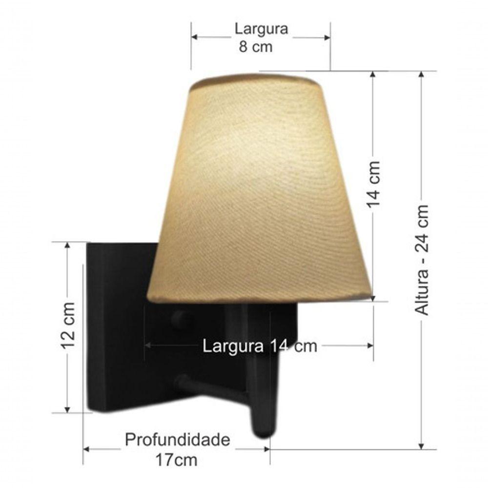 Arandela Quadrada Md-2034 Preto Cúpula Em Tecido Cone Algodão Crú - BivoltArandela de parede Quadrada Md-2034 Preto Cúpula em Tecido Cone Algodão Crú - BivoltAs arandelas Lustres Vivare são elementos versáteis e elegantes que podem transformar qualquer ambiente em um espaço cheio de estilo. Seja para adicionar uma iluminação suave, destacar uma parede ou criar um efeito de luz diferenciado.Dimensão:Cúpula em Tecido: 14x07x14cmArandela de parede Montada: Altura 24cm Largura 14cm Profundidade 17cmFormato: Quadrado / ConeTamanho: PequenoEspecificação:Material: Cúpula em TecidoEstrutura em AlumínioBase Parede: Quadrado 12x12x2cmResistente: Á MaresiaVoltagem: 110V/220VLiga e Desliga: NãoTipo de Soquete: E27Lâmpada Utilizada: Led Bulbo Até 16w ou Fluorescente Espiral Até 25w cadaCapacidade de Lâmpadas: 1Observação:Acompanha Lâmpada: NãoPossui Led Integrado: NãoGarantia: 12 MesesManual de Instalação: SimArandela de parede Montada: SimControle de Luminosidade: NãoTipo de Embalagem: CaixaConservação e Manutenção do Produto:A Limpeza deve ser realizada com o produto desligado. Remova o lustre que pode ser lavado com sabão neutro. Nunca utilize produtos químicos e abrasivosDica:Antes de comprar o seu produto verifique as medidas, o local onde pretende instalar e se necessário o serviço de um profissional qualificado.