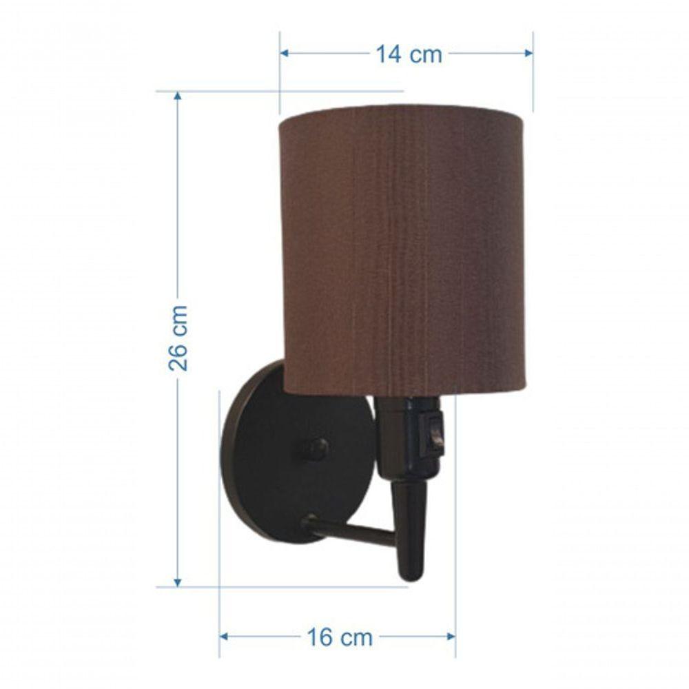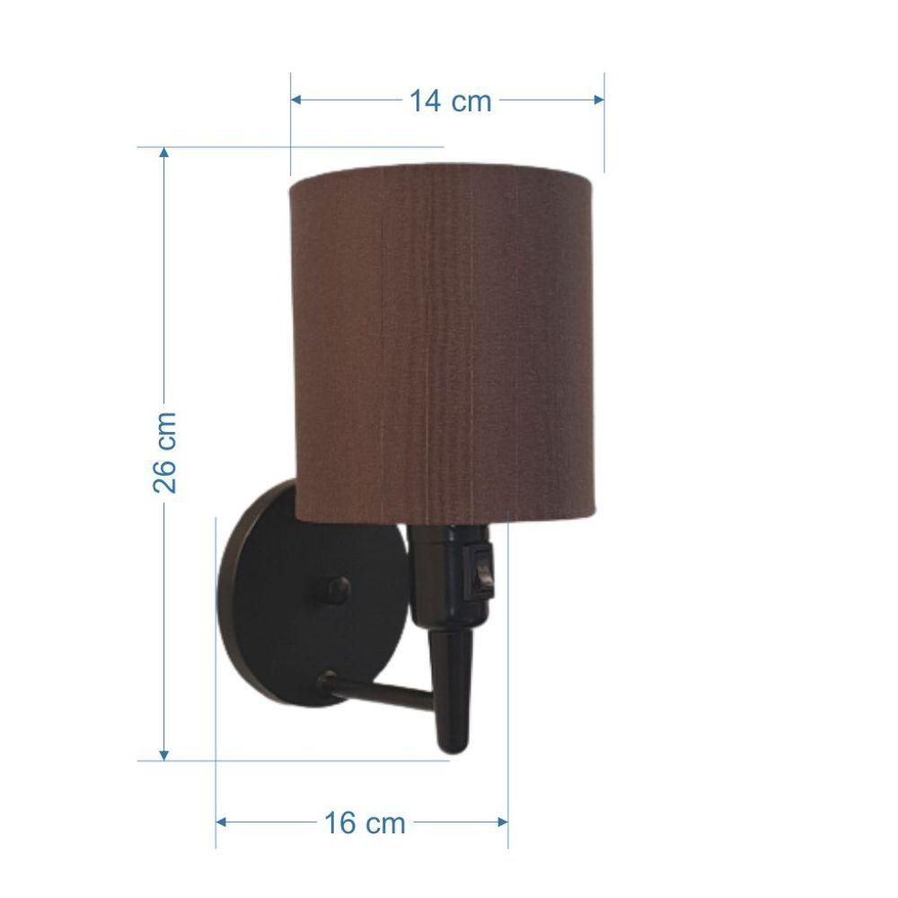 Arandela Cilíndrica Md-2030 Preto Com Liga E Desliga Cúpula Café - BivoltArandela de parede Cilíndrica Md-2030 Preto Com Liga e Desliga Cúpula Café - BivoltAs arandelas Lustres Vivare são elementos versáteis e elegantes que podem transformar qualquer ambiente em um espaço cheio de estilo. Seja para adicionar uma iluminação suave, destacar uma parede ou criar um efeito de luz diferenciado.Dimensão:Cúpula em Tecido: 14x15cmFormato: CilíndricaTamanho: PequenoEspecificação:Material: Cúpula em Tecido, Estrutura em AlumínioBase Parede: Diâmetro 11x1,2cmResistente: Á MaresiaVoltagem: 110V/220VLiga e Desliga: Interruptor no SoqueteTipo de Soquete: E27Lâmpada Utilizada: Led Bulbo até 16w ou Fluorescente Espiral até 25w CadaCapacidade de Lâmpadas: 1Observação:Acompanha Lâmpada: NãoPossui Led Integrado: NãoGarantia: 12 MesesManual de Instalação: SimArandela de parede Montada: SimControle de Luminosidade: NãoTipo de Embalagem: CaixaConservação e Manutenção do Produto:A Limpeza deve ser realizada com o produto desligado. Remova o lustre que pode ser lavado com sabão neutro. Nunca utilize produtos químicos e abrasivosDica:Antes de comprar o seu produto verifique as medidas, o local onde pretende instalar e se necessário o serviço de um profissional qualificado.