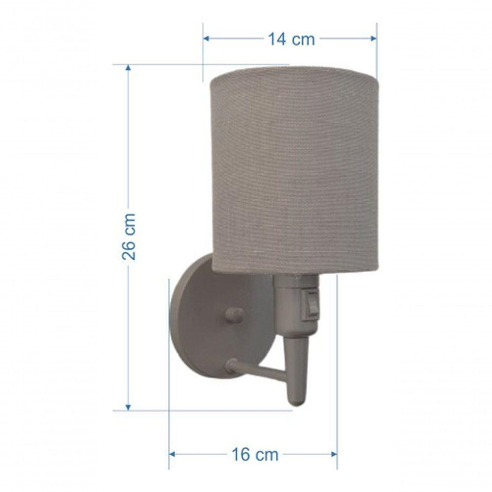 Arandela Cilíndrica Md-2030 Cinza Com Liga E Desliga Cúpula Rustico Cinza - BivoltArandela de parede Cilíndrica Md-2030 Cinza Com Liga e Desliga Cúpula Rustico Cinza - BivoltAs arandelas Lustres Vivare são elementos versáteis e elegantes que podem transformar qualquer ambiente em um espaço cheio de estilo. Seja para adicionar uma iluminação suave, destacar uma parede ou criar um efeito de luz diferenciado.Dimensão:Cúpula em Tecido: 14x15cmFormato: CilíndricaTamanho: PequenoEspecificação:Material: Cúpula em Tecido, Estrutura em AlumínioBase Parede: Diâmetro 11x1,2cmResistente: Á MaresiaVoltagem: 110V/220VLiga e Desliga: Interruptor no SoqueteTipo de Soquete: E27Lâmpada Utilizada: Led Bulbo até 16w ou Fluorescente Espiral até 25w CadaCapacidade de Lâmpadas: 1Observação:Acompanha Lâmpada: NãoPossui Led Integrado: NãoGarantia: 12 MesesManual de Instalação: SimArandela de parede Montada: SimControle de Luminosidade: NãoTipo de Embalagem: CaixaConservação e Manutenção do Produto:A Limpeza deve ser realizada com o produto desligado. Remova o lustre que pode ser lavado com sabão neutro. Nunca utilize produtos químicos e abrasivosDica:Antes de comprar o seu produto verifique as medidas, o local onde pretende instalar e se necessário o serviço de um profissional qualificado.