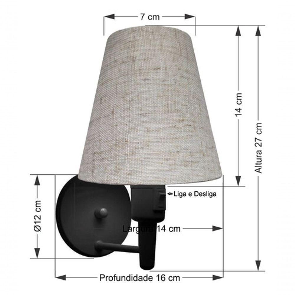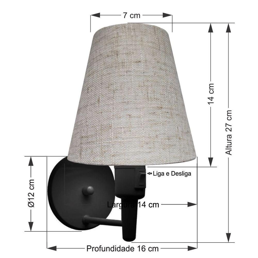 Kit/2 Arandela Cone Md-2013 Preto C/ Inter Liga E Desl Cúpula Em Tecido Rustico Bege - BivoltKit/2 Arandela de parede Cone Md-2013 Preto C/ Inter Liga e Desl Cúpula Tecido Rustico BegeAs arandelas Lustres Vivare são elementos versáteis e elegantes que podem transformar qualquer ambiente em um espaço cheio de estilo. Seja para adicionar uma iluminação suave, destacar uma parede ou criar um efeito de luz diferenciado.Dimensão:Cúpula em Tecido: 14x07x14cmArandela de parede Montada: Altura 27cm Largura 14cm Profundidade 16cmFormato: ConeTamanho: PequenoEspecificação:Material: Cúpula em TecidoEstrutura em AlumínioBase Parede: Diâmetro 11x1,2cmResistente: Á MaresiaVoltagem: 110V/220VLiga e Desliga: Interruptor no SoqueteTipo de Soquete: E27Tipo de Lâmpada: Led Bulbo até 16w ou Fluorescente Espiral até 25w CadaCapacidade de Lâmpadas: 1Observação:Acompanha Lâmpada: NãoPossui Led Integrado: NãoGarantia: 12 MesesManual de Instalação: SimArandela de parede Montada: SimControle de Luminosidade: NãoTipo de Embalagem: CaixaConservação e Manutenção do Produto:A Limpeza deve ser realizada com o produto desligado. Remova o lustre que pode ser lavado com sabão neutro. Nunca utilize produtos químicos e abrasivosAntes de comprar o seu produto verifique as medidas, o local onde pretende instalar e se necessário o serviço de um profissional qualificado.