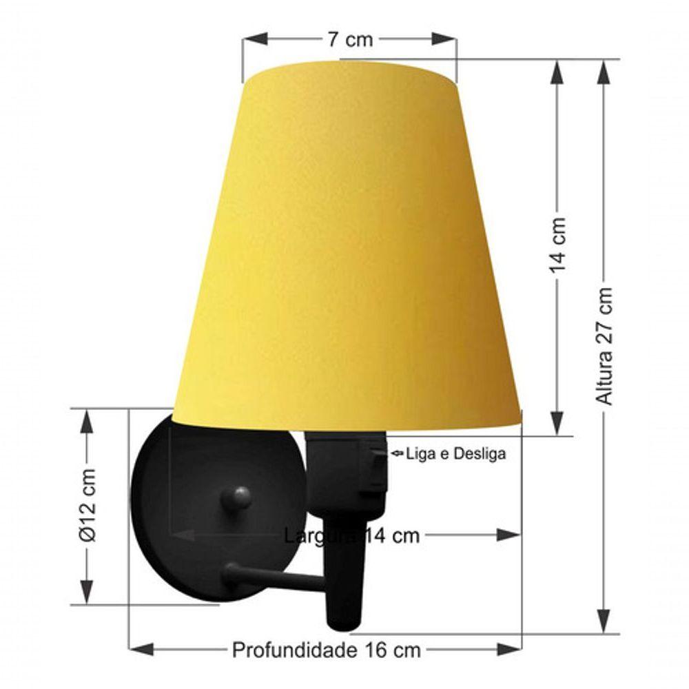 Kit/2 Arandela Cone Md-2013 Preto C/ Inter Liga E Desl Cúpula Em Tecido Amarelo - BivoltKit/2 Arandela de parede Cone Md-2013 Preto C/ Inter Liga e Desl Cúpula Tecido AmareloAs arandelas Lustres Vivare são elementos versáteis e elegantes que podem transformar qualquer ambiente em um espaço cheio de estilo. Seja para adicionar uma iluminação suave, destacar uma parede ou criar um efeito de luz diferenciado.Dimensão:Cúpula em Tecido: 14x07x14cmArandela de parede Montada: Altura 27cm Largura 14cm Profundidade 16cmFormato: ConeTamanho: PequenoEspecificação:Material: Cúpula em TecidoEstrutura em AlumínioBase Parede: Diâmetro 11x1,2cmResistente: Á MaresiaVoltagem: 110V/220VLiga e Desliga: Interruptor no SoqueteTipo de Soquete: E27Tipo de Lâmpada: Led Bulbo até 16w ou Fluorescente Espiral até 25w CadaCapacidade de Lâmpadas: 1Observação:Acompanha Lâmpada: NãoPossui Led Integrado: NãoGarantia: 12 MesesManual de Instalação: SimArandela de parede Montada: SimControle de Luminosidade: NãoTipo de Embalagem: CaixaConservação e Manutenção do Produto:A Limpeza deve ser realizada com o produto desligado. Remova o lustre que pode ser lavado com sabão neutro. Nunca utilize produtos químicos e abrasivosAntes de comprar o seu produto verifique as medidas, o local onde pretende instalar e se necessário o serviço de um profissional qualificado.
