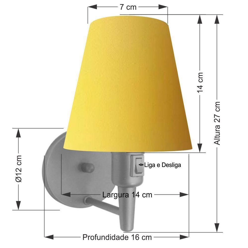 Kit/2 Arandela Cone Md-2013 Cinza C/ Inter Liga E Desl Cúpula Em Tecido Amarelo - BivoltKit/2 Arandela de parede Cone Md-2013 Cinza C/ Inter Liga e Desl Cúpula Tecido AmareloAs arandelas Lustres Vivare são elementos versáteis e elegantes que podem transformar qualquer ambiente em um espaço cheio de estilo. Seja para adicionar uma iluminação suave, destacar uma parede ou criar um efeito de luz diferenciado.Dimensão:Cúpula em Tecido: 14x07x14cmArandela de parede Montada: Altura 27cm Largura 14cm Profundidade 16cmFormato: ConeTamanho: PequenoEspecificação:Material: Cúpula em TecidoEstrutura em AlumínioBase Parede: Diâmetro 11x1,2cmResistente: Á MaresiaVoltagem: 110V/220VLiga e Desliga: Interruptor no SoqueteTipo de Soquete: E27Tipo de Lâmpada: Led Bulbo até 16w ou Fluorescente Espiral até 25w CadaCapacidade de Lâmpadas: 1Observação:Acompanha Lâmpada: NãoPossui Led Integrado: NãoGarantia: 12 MesesManual de Instalação: SimArandela de parede Montada: SimControle de Luminosidade: NãoTipo de Embalagem: CaixaConservação e Manutenção do Produto:A Limpeza deve ser realizada com o produto desligado. Remova o lustre que pode ser lavado com sabão neutro. Nunca utilize produtos químicos e abrasivosAntes de comprar o seu produto verifique as medidas, o local onde pretende instalar e se necessário o serviço de um profissional qualificado.