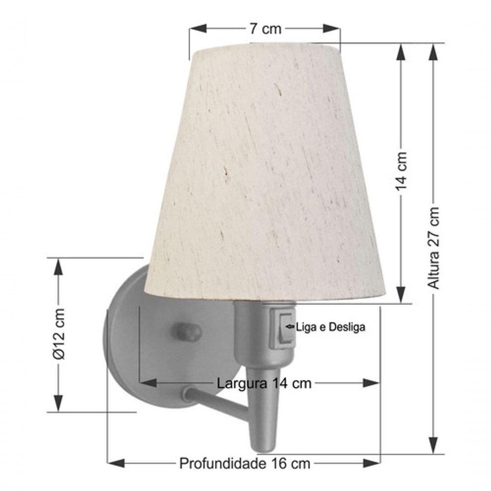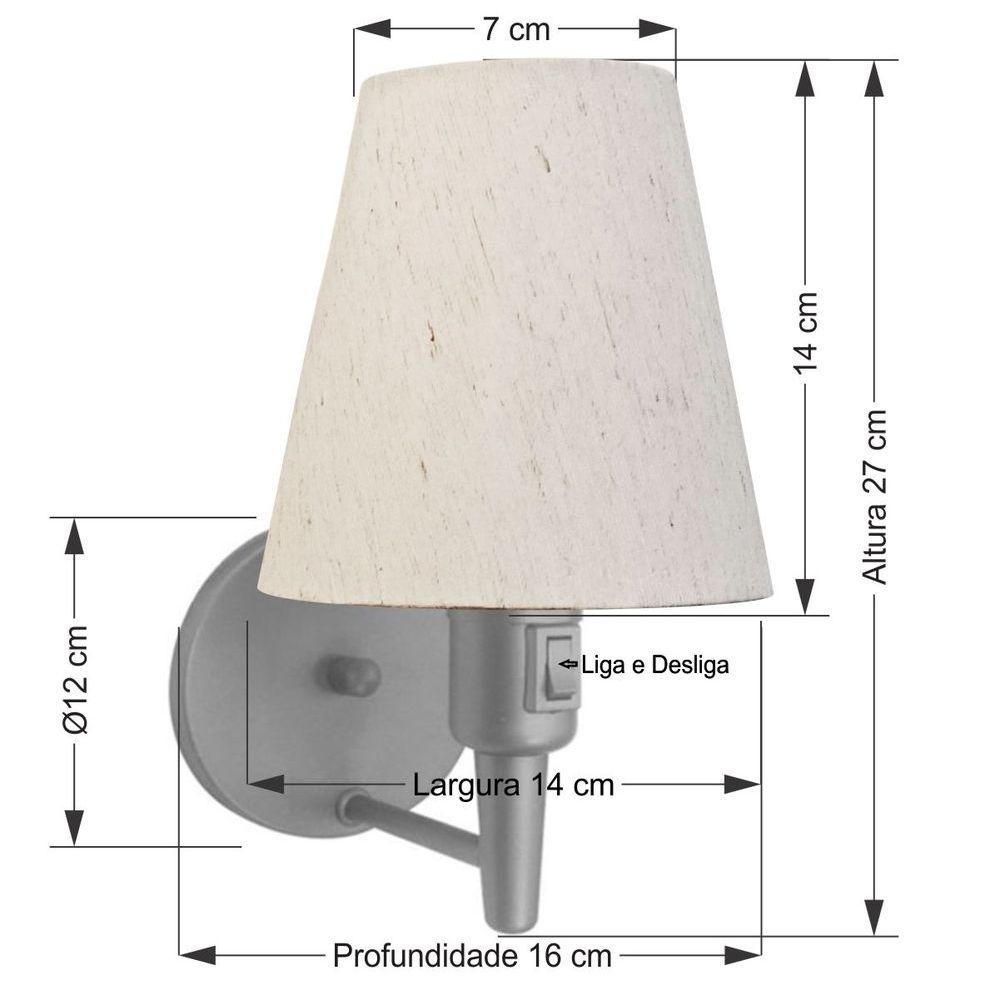 Kit/2 Arandela Cone Md-2013 Cinza C/ Inter Liga E Desl Cúpula Em Tecido Linho Bege - BivoltKit/2 Arandela de parede Cone Md-2013 Cinza C/ Inter Liga e Desl Cúpula Tecido Linho BegeAs arandelas Lustres Vivare são elementos versáteis e elegantes que podem transformar qualquer ambiente em um espaço cheio de estilo. Seja para adicionar uma iluminação suave, destacar uma parede ou criar um efeito de luz diferenciado.Dimensão:Cúpula em Tecido: 14x07x14cmArandela de parede Montada: Altura 27cm Largura 14cm Profundidade 16cmFormato: ConeTamanho: PequenoEspecificação:Material: Cúpula em TecidoEstrutura em AlumínioBase Parede: Diâmetro 11x1,2cmResistente: Á MaresiaVoltagem: 110V/220VLiga e Desliga: Interruptor no SoqueteTipo de Soquete: E27Tipo de Lâmpada: Led Bulbo até 16w ou Fluorescente Espiral até 25w CadaCapacidade de Lâmpadas: 1Observação:Acompanha Lâmpada: NãoPossui Led Integrado: NãoGarantia: 12 MesesManual de Instalação: SimArandela de parede Montada: SimControle de Luminosidade: NãoTipo de Embalagem: CaixaConservação e Manutenção do Produto:A Limpeza deve ser realizada com o produto desligado. Remova o lustre que pode ser lavado com sabão neutro. Nunca utilize produtos químicos e abrasivosAntes de comprar o seu produto verifique as medidas, o local onde pretende instalar e se necessário o serviço de um profissional qualificado.