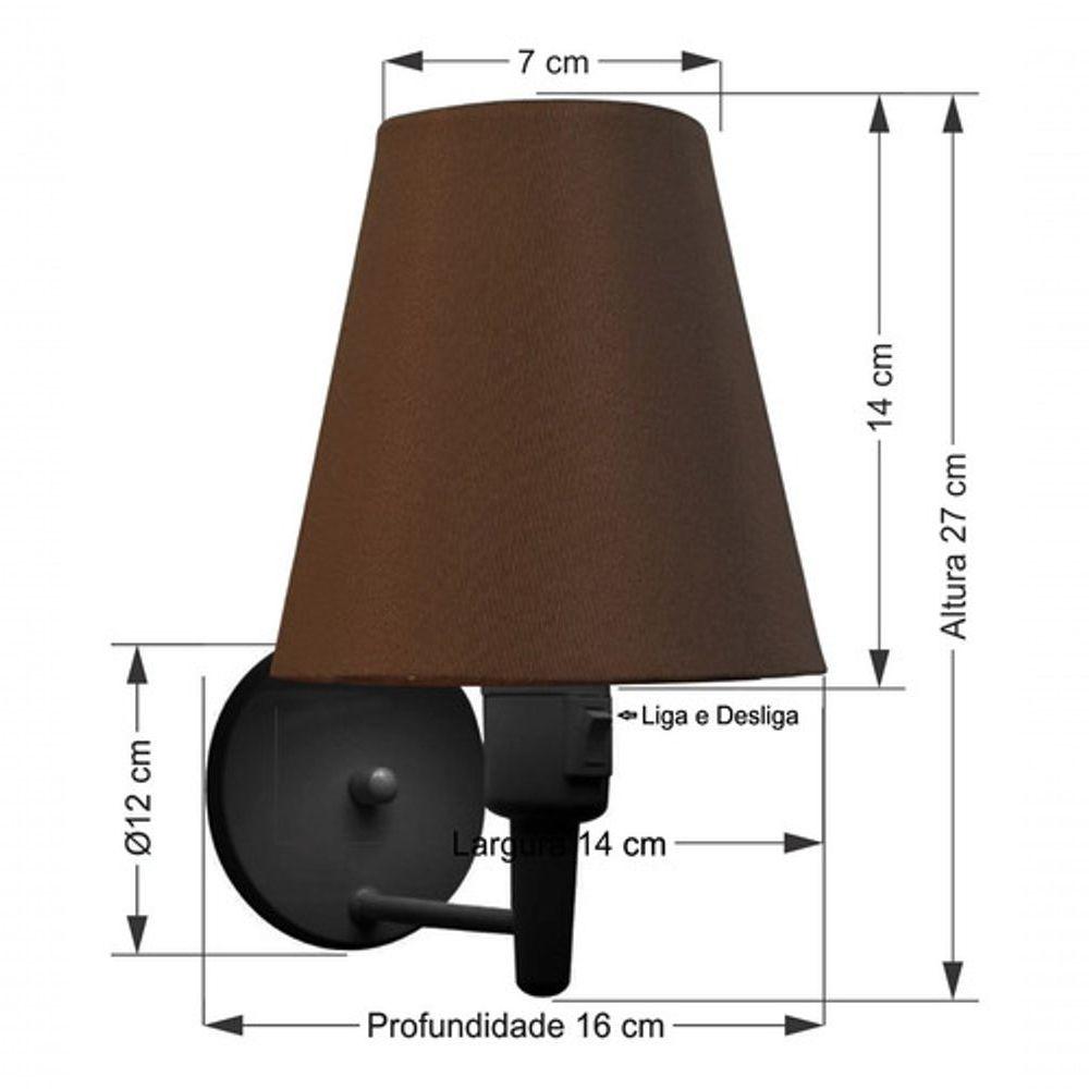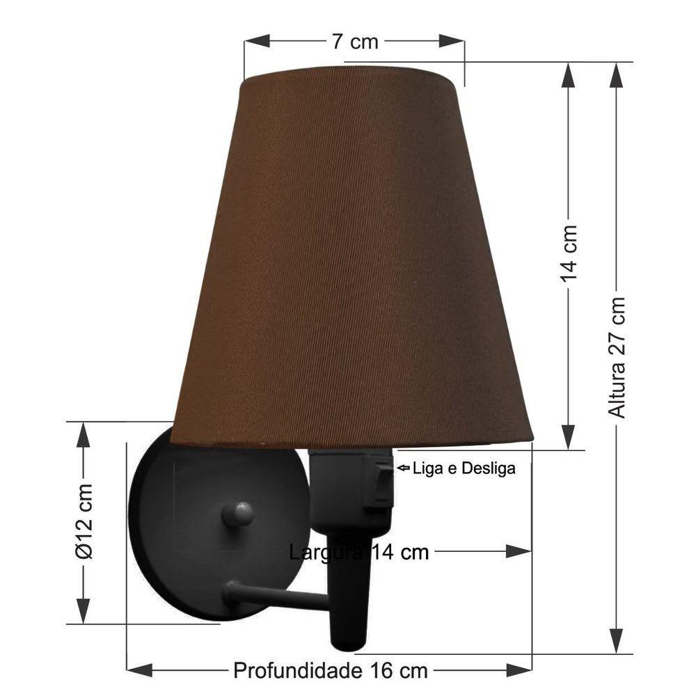 Kit/2 Arandela Cone Md-2013 Preto C/ Inter Liga E Desl Cúpula Em Tecido Café - BivoltKit/2 Arandela de parede Cone Md-2013 Preto C/ Inter Liga e Desl Cúpula Tecido CaféAs arandelas Lustres Vivare são elementos versáteis e elegantes que podem transformar qualquer ambiente em um espaço cheio de estilo. Seja para adicionar uma iluminação suave, destacar uma parede ou criar um efeito de luz diferenciado.Dimensão:Cúpula em Tecido: 14x07x14cmArandela de parede Montada: Altura 27cm Largura 14cm Profundidade 16cmFormato: ConeTamanho: PequenoEspecificação:Material: Cúpula em TecidoEstrutura em AlumínioBase Parede: Diâmetro 11x1,2cmResistente: Á MaresiaVoltagem: 110V/220VLiga e Desliga: Interruptor no SoqueteTipo de Soquete: E27Tipo de Lâmpada: Led Bulbo até 16w ou Fluorescente Espiral até 25w CadaCapacidade de Lâmpadas: 1Observação:Acompanha Lâmpada: NãoPossui Led Integrado: NãoGarantia: 12 MesesManual de Instalação: SimArandela de parede Montada: SimControle de Luminosidade: NãoTipo de Embalagem: CaixaConservação e Manutenção do Produto:A Limpeza deve ser realizada com o produto desligado. Remova o lustre que pode ser lavado com sabão neutro. Nunca utilize produtos químicos e abrasivosAntes de comprar o seu produto verifique as medidas, o local onde pretende instalar e se necessário o serviço de um profissional qualificado.