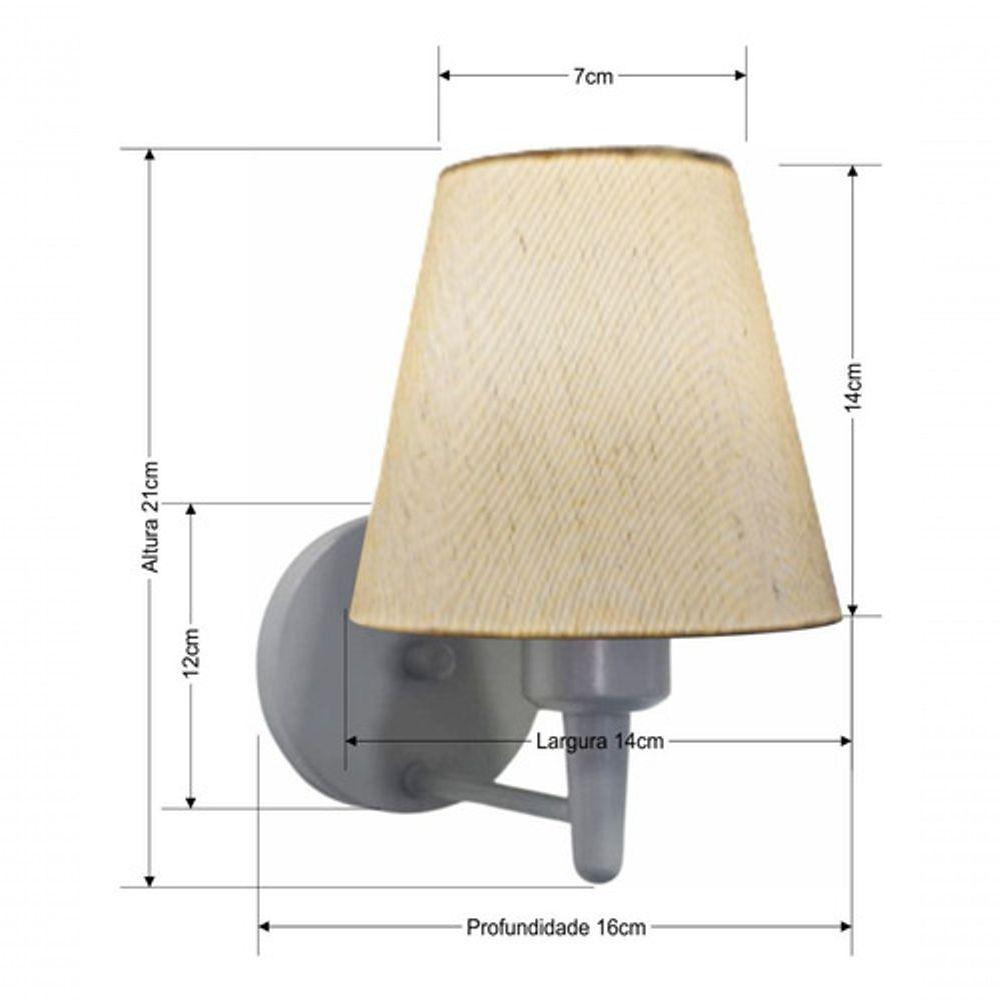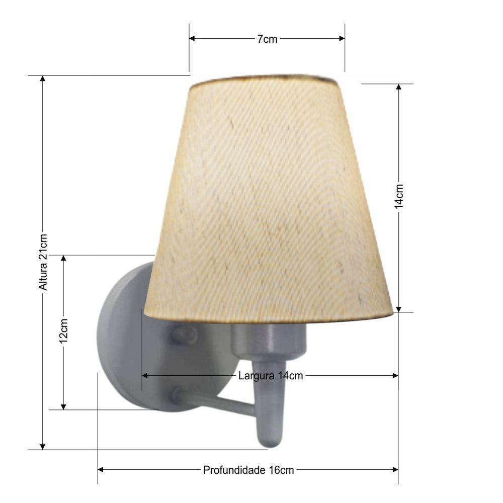 Arandela Parede Vivare Md-2004 Cinza Cúpula Em Tecido - Bivolt Cinza-linho-bege 127/220vArandela Parede Vivare Md-2004 Cinza Cúpula em Tecido - BivoltAs arandelas Lustres Vivare são elementos versáteis e elegantes que podem transformar qualquer ambiente em um espaço cheio de estilo. Seja para adicionar uma iluminação suave, destacar uma parede de quarto ou sala e criar um efeito de luz diferenciado.Dimensão:Cúpula em Tecido: 14x7x14cmArandela de parede Montada: Altura 21cm Largura 14cm Profundidade 16cmFormato: ConeTamanho: PequenoEspecificação:Material: Cúpula em TecidoEstrutura em AlumínioBase Parede: Diâmetro 11x1,2cmResistente: Á MaresiaVoltagem: 110V/220VLiga e Desliga: NãoTipo de Soquete: E27Lâmpada Utilizada: Led Bulbo Até 16w ou Fluorescente Espiral Até 25w CadaCapacidade de Lâmpadas: 1Observação:Acompanha Lâmpada: NãoPossui Led Integrado: NãoGarantia: 12 MesesManual de Instalação: SimArandela de parede Montada: SimControle de Luminosidade: NãoTipo de Embalagem: CaixaConservação e Manutenção do Produto:A Limpeza deve ser realizada com o produto desligado. Remova o lustre que pode ser lavado com sabão neutro. Nunca utilize produtos químicos e abrasivosDica:Antes de comprar o seu produto verifique as medidas, o local onde pretende instalar e se necessário o serviço de um profissional qualificado.