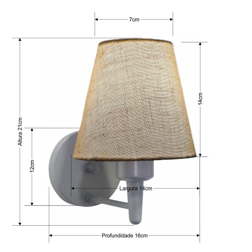 Arandela Parede Vivare Md-2004 Cinza Cúpula Em Tecido - Bivolt Cinza-rustico-bege 127/220vArandela Parede Vivare Md-2004 Cinza Cúpula em Tecido - BivoltAs arandelas Lustres Vivare são elementos versáteis e elegantes que podem transformar qualquer ambiente em um espaço cheio de estilo. Seja para adicionar uma iluminação suave, destacar uma parede de quarto ou sala e criar um efeito de luz diferenciado.Dimensão:Cúpula em Tecido: 14x7x14cmArandela de parede Montada: Altura 21cm Largura 14cm Profundidade 16cmFormato: ConeTamanho: PequenoEspecificação:Material: Cúpula em TecidoEstrutura em AlumínioBase Parede: Diâmetro 11x1,2cmResistente: Á MaresiaVoltagem: 110V/220VLiga e Desliga: NãoTipo de Soquete: E27Lâmpada Utilizada: Led Bulbo Até 16w ou Fluorescente Espiral Até 25w CadaCapacidade de Lâmpadas: 1Observação:Acompanha Lâmpada: NãoPossui Led Integrado: NãoGarantia: 12 MesesManual de Instalação: SimArandela de parede Montada: SimControle de Luminosidade: NãoTipo de Embalagem: CaixaConservação e Manutenção do Produto:A Limpeza deve ser realizada com o produto desligado. Remova o lustre que pode ser lavado com sabão neutro. Nunca utilize produtos químicos e abrasivosDica:Antes de comprar o seu produto verifique as medidas, o local onde pretende instalar e se necessário o serviço de um profissional qualificado.