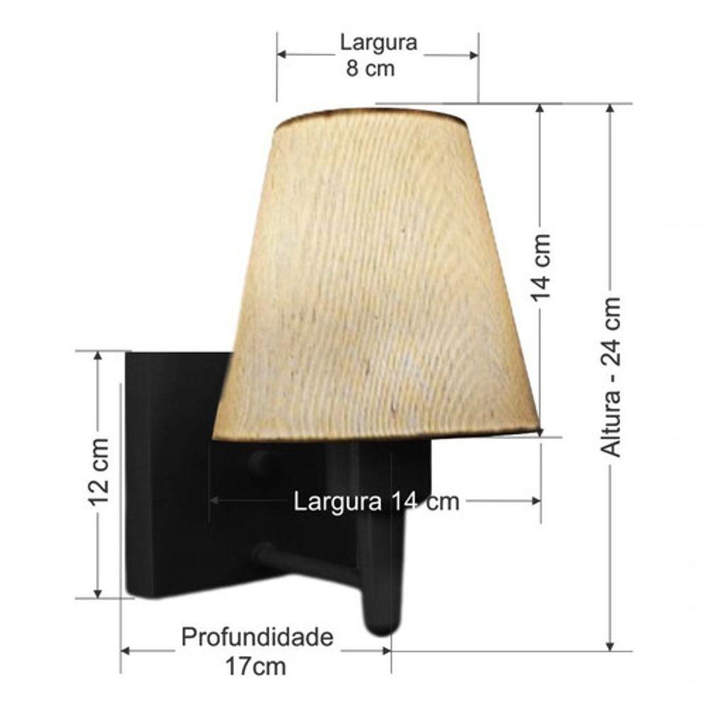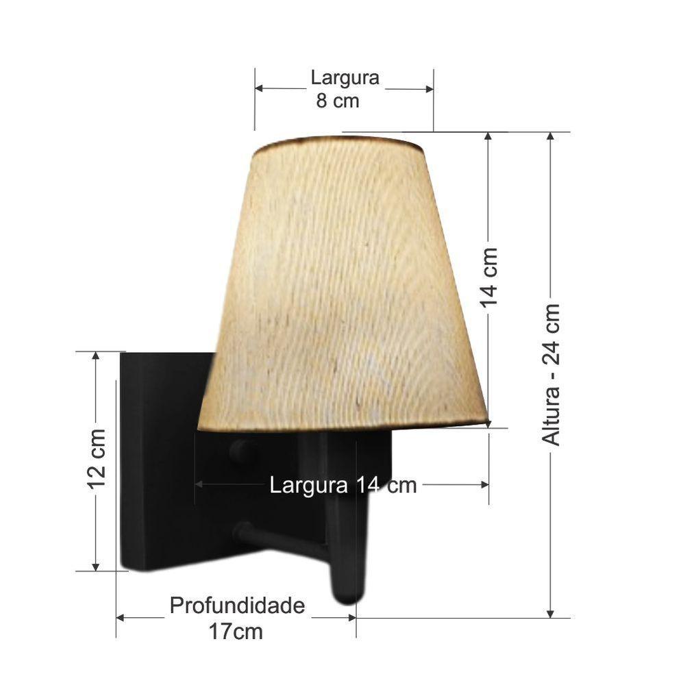 Arandela Quadrada Md-2034 Preto Cúpula Em Tecido Cone Linho Bege - BivoltArandela de parede Quadrada Md-2034 Preto Cúpula em Tecido Cone Linho Bege - BivoltAs arandelas Lustres Vivare são elementos versáteis e elegantes que podem transformar qualquer ambiente em um espaço cheio de estilo. Seja para adicionar uma iluminação suave, destacar uma parede ou criar um efeito de luz diferenciado.Dimensão:Cúpula em Tecido: 14x07x14cmArandela de parede Montada: Altura 24cm Largura 14cm Profundidade 17cmFormato: Quadrado / ConeTamanho: PequenoEspecificação:Material: Cúpula em TecidoEstrutura em AlumínioBase Parede: Quadrado 12x12x2cmResistente: Á MaresiaVoltagem: 110V/220VLiga e Desliga: NãoTipo de Soquete: E27Lâmpada Utilizada: Led Bulbo Até 16w ou Fluorescente Espiral Até 25w cadaCapacidade de Lâmpadas: 1Observação:Acompanha Lâmpada: NãoPossui Led Integrado: NãoGarantia: 12 MesesManual de Instalação: SimArandela de parede Montada: SimControle de Luminosidade: NãoTipo de Embalagem: CaixaConservação e Manutenção do Produto:A Limpeza deve ser realizada com o produto desligado. Remova o lustre que pode ser lavado com sabão neutro. Nunca utilize produtos químicos e abrasivosDica:Antes de comprar o seu produto verifique as medidas, o local onde pretende instalar e se necessário o serviço de um profissional qualificado.