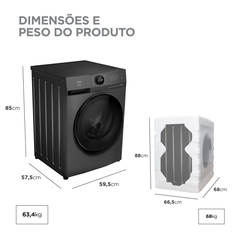Lava e Seca 11kg Titanium Slim Healthguard Conectada Midea MF201D110WB/GK-02 - 220VLava e Seca 11kg Slim HealthGuard Conectada Midea: mesma capacidade em menos espaço.Com design compacto e moderno, possui dimensões reduzidas que otimizam espaço sem comprometer a capacidade e eficiência da máquina.Com conectividade avançada, é possível controlar a máquina via aplicativo SmartHome e por comando de voz ( e Home). Além de receber notificações, customize programas e acione diversas funções.Destaque para a Função Especialista, que recomenda a lavagem mais adequada de acordo com o tipo de roupa e nível de sujeira.As novas máquinas contam com as tecnologias exclusivas Health Guard, que garantem a limpeza e esterilização profundas nos programas de lavagem, e Função Turbo, que acelera o ciclo de lavagem.Programas e Ciclos:Programas (quantidade): 14 + 5 no APPProgramas: Favorito, Algodão, Mix, Sintético, Esterilizar, Centrifugar, Secar, Rápido 15 60, Desodorizar, Super ECO, Delicado ou lã, Pesado ou jeans, Edredom, Limpeza do TamborCiclos disponíveis: Pré-lavagem, Lavagem, Enxágue, Centrifugação, SecagemAcompanhamento dos estágios de ciclo: SimFunções:Funções (quantidade): 10Funções: Turbo, Centrifugar, Temperatura, Adiar início, +Roupa, Vapor, Secar, Tira mancha, Enxágue+, TravarTemperatura e Centrifugação:Range de Temperatura: Fria - 20°C - 30°C - 40°C - 50°C - 60°CVelocidade de centrifugação (rpm): 0 - 400 - 600 - 800 - 1000 - 1200 RPMConteúdo da EmbalagemMáquina de lavarMangueira de entrada de águaTampões de fechamentoSuporte para mangueira de saída de águaProtetor para ratoManual do usuárioAtenção: Não faturamos para CNPJ.Características TécnicasOrigem: Cor: TitaniumCapacidade total: 11KgCapacidade de secagem: 7KgProduto conectado: SimInverter: SimInteligência Artificial: NãoWifi: Sim com o Aplicativo Midea: Sim com e : SimTipo: Front Loading automáticaAcesso ao cesto: FrontalMaterial interno (cesto): Aço inoxMaterial externo: Plástico e Aço e VidroCor da cabine: TitaniumCor da porta: PretaCor interna: InoxModo Desodorizar: SimFunção incluir roupas: SimTecla nível de sujeira: NãoTecla iniciar/pausar: SimPainel: Touch + Knob Lunar DialTrava no painel: SimDisplay: LEDCor do display: Azul e BrancoTipo de trava: EletrônicoPés ajustáveis: SimPainel com aviso de erro: SimTimer: Sim (24h)Tipo do Motor: BLDCLuz no cesto: NãoFiltro: SimDispenser: Sabão e amacianteTipo de água: Água friaConsumo de Energia - Água Fria (kWh/ciclo) (220v): ,29Consumo de Energia - Água Quente (kWh/ciclo) (220v): 1,8Eficiência de Lavagem - Água Fria (220v): ,97Eficiência de Lavagem - Água Quente (220v): 1,06Consumo de Água (L/ciclo) (220v): 83Selo Procel: SimClassificação energética: AFrequência (Hz): 60HzTipo de tomada: 10 APotência Sonora (Nível de Ruído): 79 dB(A)Produto Altura (cm): 85 cmProduto Largura (cm): 59,5 cmProduto Profundidade (cm): 57,5 cmProduto Peso (kg): 63,4 kgProduto Embalado Altura (cm): 88 cmProduto Embalado Largura (cm): 68 cmProduto Embalado Profundidade (cm): 66,5 cmProduto Embalado Peso (kg): 68 kgGarantia: 12 meses