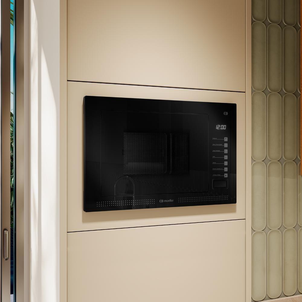 Micro-ondas De Embutir Mueller 25 Litros Preto MME25K Preto 220VCapacidade ideal para famílias, com total de 1450 W de potência, painel digital touch com cinco níveis, função descongelar por peso ou tempo, oito receitas pré-programadas, +30 s de atalho, interior em inox durável, acabamento sofisticado em vidro espelhado preto — praticidade e estilo para sua cozinha planejada.Altura (cm): 38,6 cmLargura (cm): 59,5 cmProfundidade (cm): 37 cmDimensões internas do forno: A: 21 cm | L: 33 cm | P: 33,5 cmPeso (Kg): 17,5 KgCapacidade (litros): 25 LGarantia (meses): 12Níveis de Potência: 5 Níveis de potênciaTotal Potência: 1450 WPotência modo Micro-ondas (W): 900 WFrequência (Hz): 60 HzFunção descongelar: Sim, por tempo ou pesoTipo de Painel: Painel digital com controle através do toqueCor: PretoTimer: Relógio e timer com aviso sonoro para programar o tempo que desejar.Alarme Sonoro: SimLuz no interior do Forno: SimTipo: Micro-ondas de EmbutirNA Cor: Preto Voltagem: 220V