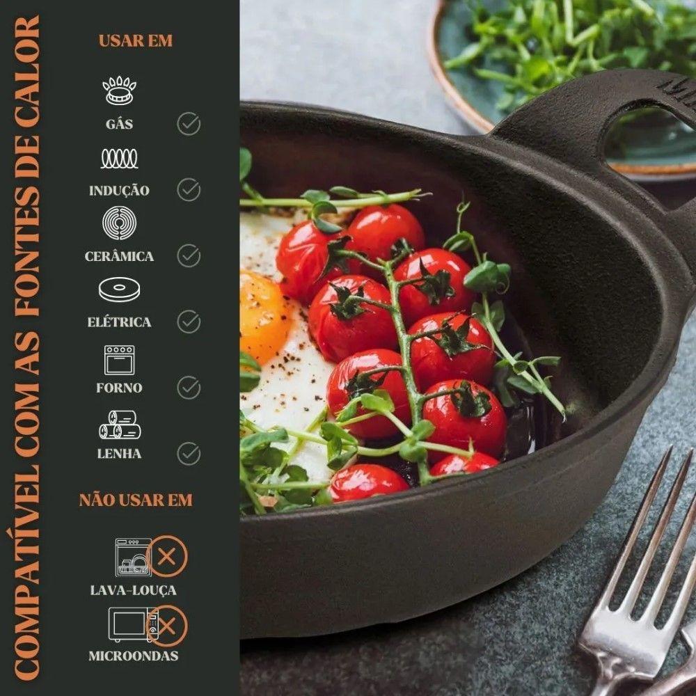 Kit 3 Travessas Redonda 14 Cm 0,4l Em Ferro Fundido Panela MineiraKit 3 Travessas Redonda 14 cm 0,4L em Ferro Fundido Panela MineiraA Travessa Estilo Redonda Alça de Ferro da Panela Mineira é um produto moderno, prático e eficiente, que apresenta alto desempenho no preparo de diversas receitas. O calor distribuído por toda a superfície faz com que o alimento cozinhe de maneira uniforme, conservando suas propriedades e nutrientes. Além de tudo, possui um design autêntico e elegante, com fundo reto preto e alças largas, o que a torna excelente para assar, grelhar, fritar, cozinhar e servir. Muito utilizada em bares e restaurantes para porções menores.Kit 3 Travessas Redonda 14 cm 0,4L em Ferro Fundido Panela Mineira - Itens03 Travessas P (Compr. X Larg. X Alt.): 14 x 14 x 3,5 cm / Capacidade: 0,4LKit 3 Travessas Redonda 0,4L em Ferro Fundido Panela Mineira - Especificações TécnicasMaterial: Ferro Fundido.Revestimento: Tinta atóxica.Cabo: Ferro Fundido.Pode ser utilizada nos fogões: elétrico, gás, indução, vitrocerâmico e a lenha.Não pode ir: Micro-ondas e lava louça.