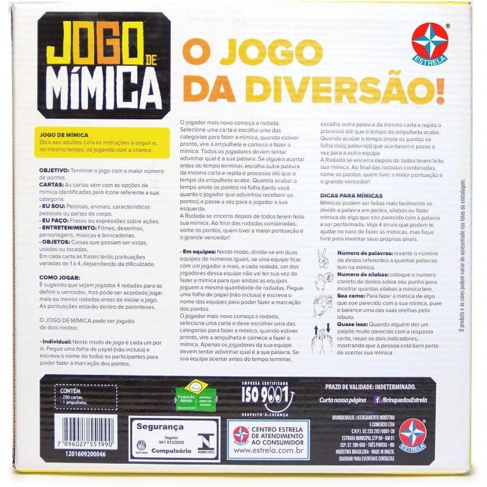 Jogo Da Mímica - EstrelaQue tal adicionar um toque de diversão e risadas à sua próxima reunião de família ou encontro com amigos? Com o Jogo da Mímica da Estrela, você pode fazer exatamente isso! Este jogo clássico é perfeito para todas as idades e oferece uma maneira emocionante de colocar suas habilidades de expressão corporal à prova. Prepare-se para momentos de muita diversão enquanto você tenta transmitir palavras e frases sem dizer uma única palavra!O Jogo da Mímica é uma escolha ideal para animar qualquer ocasião. Com sua mecânica simples e fácil de entender, é uma ótima opção para jogadores de todas as habilidades. Desde crianças até adultos, todos podem se divertir tentando adivinhar as pistas enquanto os participantes encaram o desafio de representar uma variedade de palavras e expressões usando apenas gestos e movimentos corporais. Não perca a oportunidade de adicionar esse clássico atemporal à sua coleção de jogos!Experimente a emoção e a camaradagem do Jogo da Mímica da Estrela. Este jogo interativo e envolvente promete horas de diversão e risadas para toda a família. Adquira já o seu e embarque em uma jornada de expressão criativa e entretenimento sem fim!