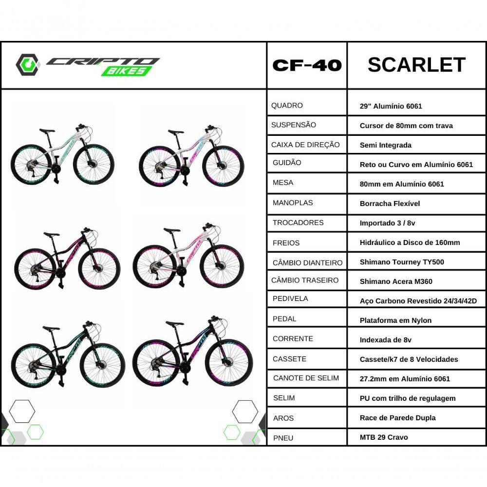 Bicicleta Aro 29 Cripto 24v Acera Freio Hidraulico Trava/k7 - Preto/rosa - 17" Preto/rosaBicicleta bem completa para atender pesseios ou ate mesmo aquela trilha nos finais de semana.QUADRO : 29 Alumínio 6061SUSPENSÃO : Curso de 100mm com Trava OmbroCAIXA DE DIREÇÃO : Semi IntegradaGUIDÃO : Reto ou Curvo em Alumínio 6061MESA : 80mm em Alumínio 6061MANOPLAS : Borracha FlexívelTROCADORES : Importado 3 / 9vFREIOS : Hidraulico a Disco de 160mmCÂMBIO TRASEIRO : Shimano Acera M360CÂMBIO DIANTEIRO : Shimano Tourney TY500PEDIVELA : Alumino 42/34/24DPEDAL : PlataformaCORRENTE : Indexada de 9vCatraca: Cassete/k7 de 9 VelocidadesCANOTE DE SELIM : 27.2mm em Alumínio 6061SELIM : PU com trilho de regulagemAros : Race de Parede DuplaPNEU : MTB 29 CravoOBSERVAÇÕES:- Imagens Ilustrativas. Pode haver alguma diferença de tonalidade entre a imagem e o produto real, por conta do tratamento de imagens e a calibração de cores do seu monitor ou celular!- As fotos do anúncio são feitas com quadros do tamanho 17.- A geometria do quadro (desenho) pode mudar conforme o tamanho escolhido alterando a inclinação do tubo superior quando quadro é 21 deixando-o mais reto.- Imagens meramente ilustrativas, podendo ter variação de peças de acordo com nosso estoque, sempre com qualidade igual ou superior!- Enviamos a bicicleta pré-montada, devidamente embalada, para melhor se acomodar na embalagem de transporte são retirados apenas: selim, pedais, guidão e roda dianteira.- NÃO COBRE DEFEITOS POR MAU USO OU PELA MONTAGEM / REVISÃO INADEQUADA DO PRODUTO.- A garantia será validada para as bicicletas montadas e revisadas por uma oficina especializada e é referente apenas ao primeiro proprietário.- A garantia não se aplica para os itens de desgaste natural, tais como: Pneu, câmaras, cabos, sapatas de freio, centragem de aros, pintura do quadro, componentes da transmissão (corrente, engrenagens do pé de vela, engrenagens do cassete) Suspensão: Dianteira | Modalidade: Mountain Bike | Aro: 29 | Marchas: 24 Cor: Preto/Rosa