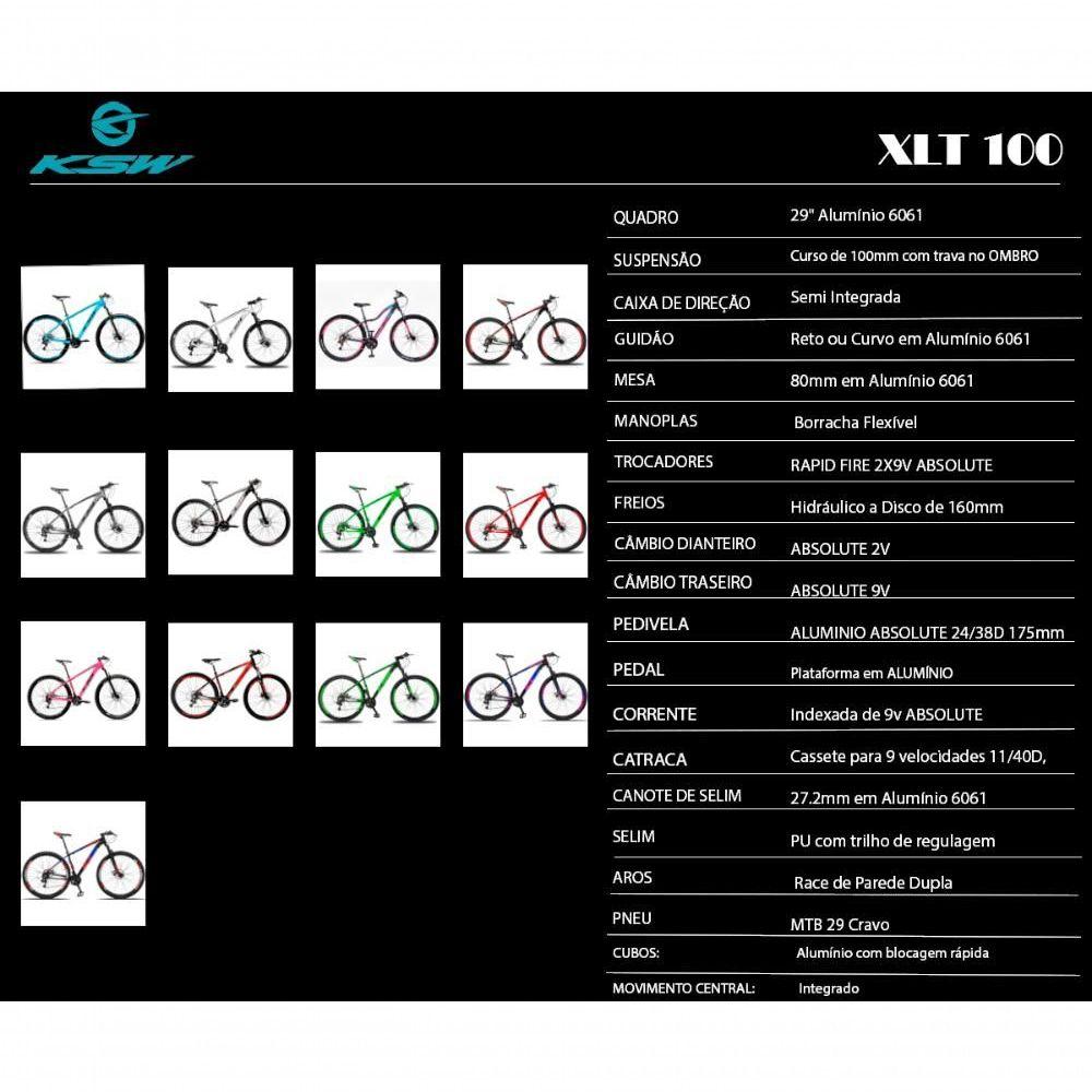 Bicicleta Aro 29 Ksw 18v Absolute Hidráulica Trava K7 11/40 - Grafite/preto - 21" Grafite/pretoUma mountain bike esportiva, perfeita para se iniciar no mundo do MTB, em trilhas e estradões. Sua geometria esportiva oferece um comportamento excepcional, deixando-a rápida e ágil para as melhores sensações no seu pedal.QUADRO : 29 Alumínio 6061SUSPENSÃO : Cursor de 100mm com trava no OMBROCAIXA DE DIREÇÃO : Semi IntegradaGUIDÃO : Reto ou Curvo em Alumínio 6061MESA : 80mm em Alumínio 6061MANOPLAS : Borracha FlexívelTROCADORES : RAPID FIRE 2X9V ABSOLUTEFREIOS : Hidraulico a Disco de 160mmCÂMBIO DIANTEIRO : ABSOLUTE 2VCÂMBIO TRASEIRO : ABSOLUTE 9VPEDIVELA : ALUMINIO ABSOLUTE 24/38D 175mmCUBOS: Alumínio com blocagem rapidaMOVIMENTO CENTRAL: IntegradoPEDAL : PlataformaCORRENTE : Indexada de 9v ABSOLUTECATRACA: Cassete para 9 velocidades 11/40DCANOTE DE SELIM : 27.2mm em Alumínio 6061SELIM : PU com trilho de regulagemAros : Race de Parede DuplaPNEU : MTB 29 CravoOBSERVAÇÕES:- Imagens Ilustrativas. Pode haver alguma diferença de tonalidade entre a imagem e o produto real, por conta do tratamento de imagens e a calibração de cores do seu monitor ou celular!- As fotos do anúncio são feitas com quadros do tamanho 17.- A geometria do quadro (desenho) pode mudar conforme o tamanho escolhido alterando a inclinação do tubo superior quando quadro é 21 deixando-o mais reto.- Imagens meramente ilustrativas, podendo ter variação de peças de acordo com nosso estoque, sempre com qualidade igual ou superior!- Enviamos a bicicleta pré-montada, devidamente embalada, para melhor se acomodar na embalagem de transporte são retirados apenas: selim, pedais, guidão e roda dianteira.- NÃO COBRE DEFEITOS POR MAU USO OU PELA MONTAGEM / REVISÃO INADEQUADA DO PRODUTO.- A garantia será validada para as bicicletas montadas e revisadas por uma oficina especializada e é referente apenas ao primeiro proprietário.- A garantia não se aplica para os itens de desgaste natural, tais como: Pneu, câmaras, cabos, sapatas de freio, centragem de aros, pintura do quadro, componentes da transmissão (corrente, engrenagens do pé de vela, engrenagens do cassete) Suspensão: Dianteira | Modalidade: Mountain Bike | Aro: 29 | Marchas: 18 Cor: Grafite/Preto