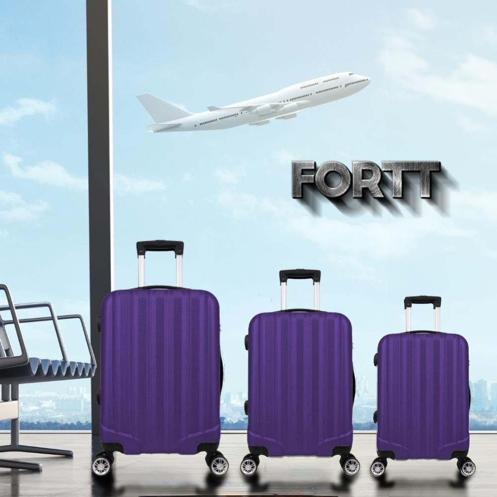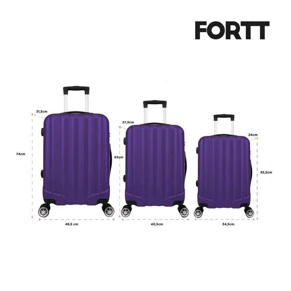 Kit Mala De Viagem ABS 3 Peças Adventure Fortt Roxa KMV01-RXKit de Malas de Viagem Rígidas 3 Peças Fortt Adventure com Rodas 360° - RoxoO Kit de Malas de Viagem Adventure da Fortt foi desenvolvido com o que há de mais moderno para suas viagens. O conjunto é produzido em ABS, um material resistente e de fácil limpeza, e conta com 3 tamanhos (P, M e G) para atender a todas as suas necessidades, de viagens curtas a longas.Principais Características:Estrutura Rígida em ABS: Garante maior proteção para seus pertences, além de ser um material leve, durável e fácil de limpar após as viagens.Rodas com Giro 360°: As 4 rodas multidirecionais proporcionam um transporte suave e sem esforço, facilitando a locomoção em aeroportos e hotéis.Cadeado Fixo com Senha: Para maior proteção dos seus itens, as malas possuem um cadeado integrado com senha configurável, oferecendo mais segurança e tranquilidade.Interior Organizado: O amplo espaço interno conta com forro em nylon, cintas elásticas para fixar as roupas e um bolso na tampa para separar itens menores, ajudando a manter tudo no lugar.Alça Retrátil de Alumínio: A alça com regulagem de altura e as alças de mão (superior e lateral) garantem mais conforto e ergonomia no manuseio.Especificações Técnicas:Marca: ForttModelo: Adventure KMV01-RXTipo: Kit de Malas de Viagem (3 Peças)Cor: RoxoMaterial: ABS (externo), Nylon (forro)Rodas: 4 rodas por mala, com giro 360°Segurança: Cadeado com senha integradoDimensões Externas [AxLxP]:P (20"): 55,5 x 34,5 x 24 cmM (24"): 65 x 40,5 x 27,5 cmG (28"): 74 x 46,5 x 31,5 cmPeso Suportado:Pequena: 8 kgMédia: 10 kgGrande: 20 kgGarantia: 90 dias