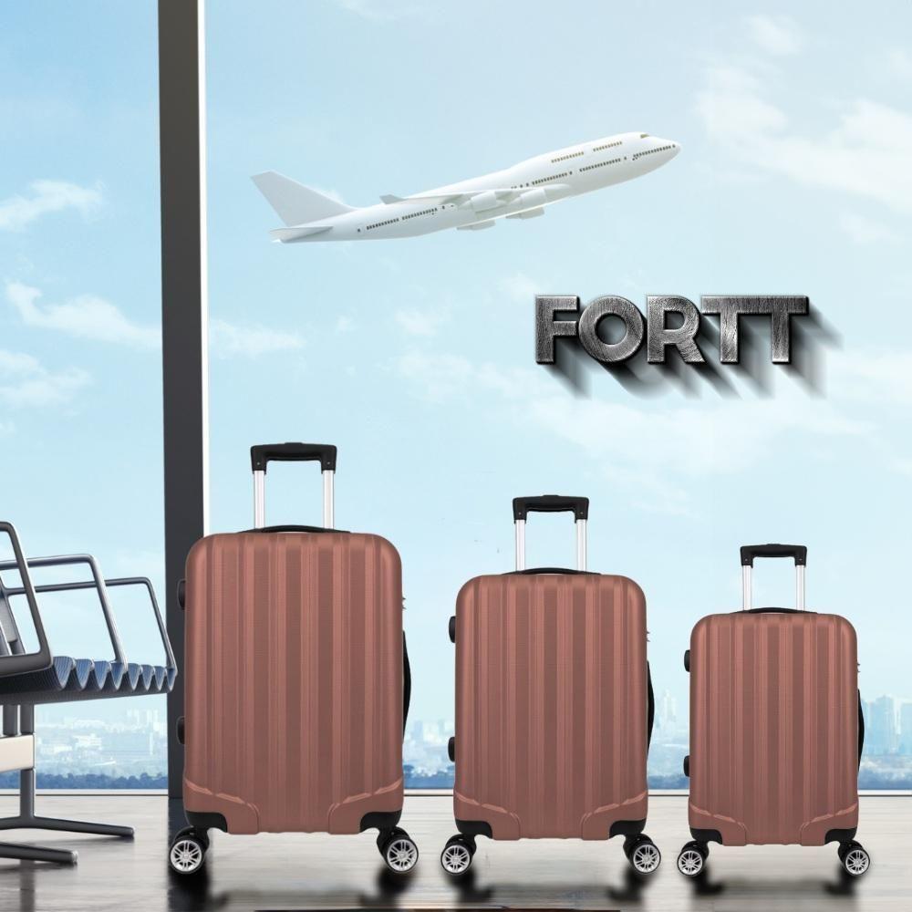 Kit Mala De Viagem ABS 3 Peças Adventure Fortt Rose KMV01-REKit de Malas de Viagem Rígidas 3 Peças Fortt Adventure com Rodas 360° - RosêO Kit de Malas de Viagem Adventure da Fortt foi desenvolvido com o que há de mais moderno para suas viagens. O conjunto é produzido em ABS, um material resistente e de fácil limpeza, e conta com 3 tamanhos (P, M e G) para atender a todas as suas necessidades, de viagens curtas a longas.Principais Características:Estrutura Rígida em ABS: Garante maior proteção para seus pertences, além de ser um material leve, durável e fácil de limpar após as viagens.Rodas com Giro 360°: As 4 rodas multidirecionais proporcionam um transporte suave e sem esforço, facilitando a locomoção em aeroportos e hotéis.Cadeado Fixo com Senha: Para maior proteção dos seus itens, as malas possuem um cadeado integrado com senha configurável, oferecendo mais segurança e tranquilidade.Interior Organizado: O amplo espaço interno conta com forro em nylon, cintas elásticas para fixar as roupas e um bolso na tampa para separar itens menores, ajudando a manter tudo no lugar.Alça Retrátil de Alumínio: A alça com regulagem de altura e as alças de mão (superior e lateral) garantem mais conforto e ergonomia no manuseio.Especificações Técnicas:Marca: ForttModelo: Adventure KMV01-RETipo: Kit de Malas de Viagem (3 Peças)Cor: RosêMaterial: ABS (externo), Nylon (forro)Rodas: 4 rodas por mala, com giro 360°Segurança: Cadeado com senha integradoDimensões Externas [AxLxP]:P (20"): 55,5 x 34,5 x 24 cmM (24"): 65 x 40,5 x 27,5 cmG (28"): 74 x 46,5 x 31,5 cmPeso Suportado:Pequena: 8 kgMédia: 10 kgGrande: 20 kgGarantia: 90 dias