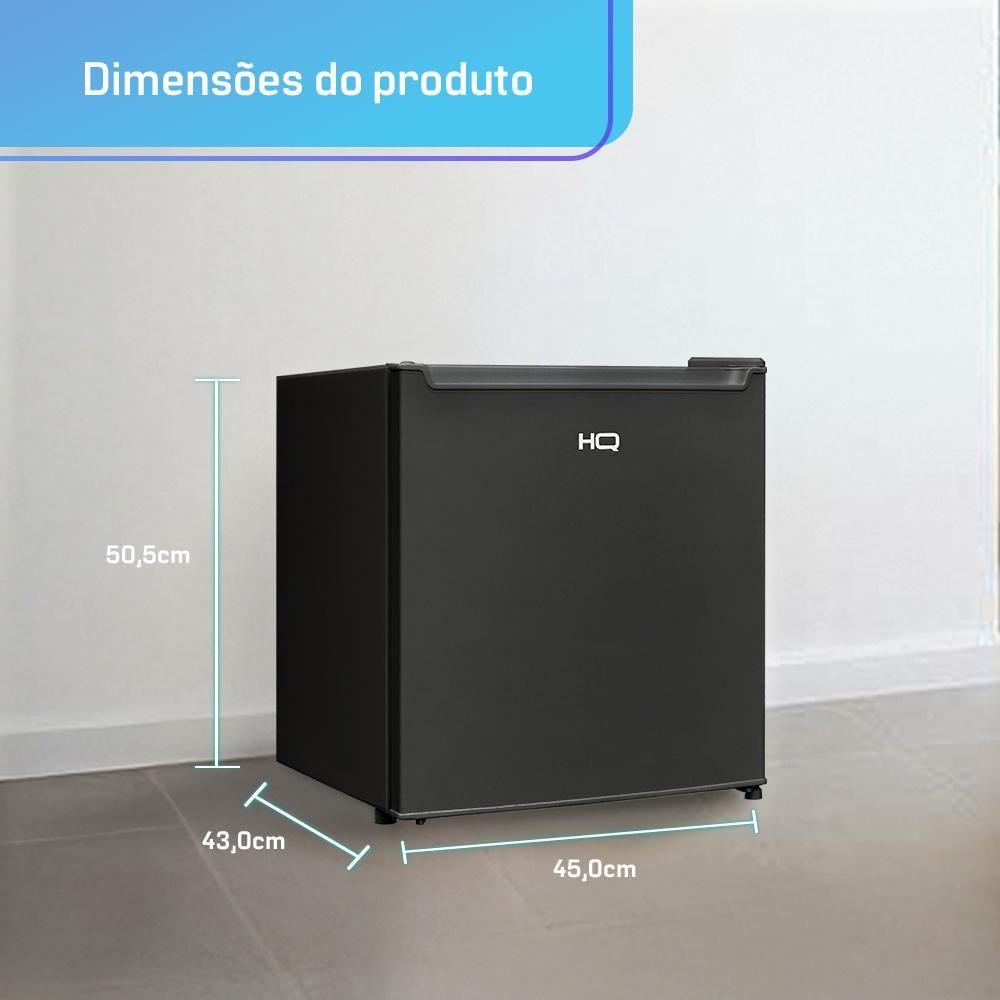 Frigobar HQ 50 Litros Preto HQ-50FB 110VFrigobar HQ 50 Litros Preto HQ-50FBO Frigobar HQ-50FB foi projetado para quem quer praticidade com baixo consumo.A classe A+++ e o consumo de 12,45 kWh/mês aliviam a conta de luz, enquanto o ruído Por que isso importa no dia a dia?- Economia com estabilidade: A+++ de verdade, pensado para uso contínuo.- Discrição onde importa: Destaques técnicos e funcionais:- Eficiência A+++ com 12,45 kWh/mês.- 50 L totais para bebidas, snacks e porções frias.- Termostato mecânico 0–5: ajuste rápido;- Faixas de temperatura: refrigerador 0–10 °C | Chiller 0 a -6 °C (sem freezer).- Degelo manual (Defrost), R600a, Classe climática T.- Ruído Cenários de uso:Casa: quarto, sala de TV, home office, área gourmet compacta.Profissional: recepção, consultórios, suítes de hotel, estações de café.Orientações de uso:- Ventilação: Deixe folga nas laterais, atrás e no topo; nivele os pés.- Primeiro uso: Aguarde estabilizar a temperatura antes de abastecer.- Ajuste inicial: Comece no nível 3 e refine conforme a carga.Facilidade de limpeza:Desligue, faça degelo manual e limpe com pano macio e detergente neutro; seque e religue.Segurança:Tomada exclusiva e aterrada (NBR 5410); evite adaptadores e benjamins. Não use aparelhos elétricos dentro do gabinete. R600a é inflamável , não perfure o circuito.Sustentabilidade:R600a + baixa demanda de energia (A+++) = menos impacto sem abrir mão do desempenho.Itens na embalagem:1 Frigobar HQ-50FB + 1 Manual de Instruções.Especificações técnicas:Capacidade total: 50 LEficiência e consumo: A+++ | 12,45 kWh/mêsNíveis de temperatura: 0–5Faixa (refri/chiller): 0–10 °C | 0 a -6 °CPeso (líq./bruto): : 13 / 14 kgDegelo: Manual (Defrost)Refrigerante: R600aRuído: Dimensões e Peso do Produto:Altura: 50,5 cmLargura: 45 cmProfundidade: 43 cmPeso: 13 KgGarantia12 Meses (3 meses de garantia legal e mais 9 meses de garantia para defeito de fabricação).