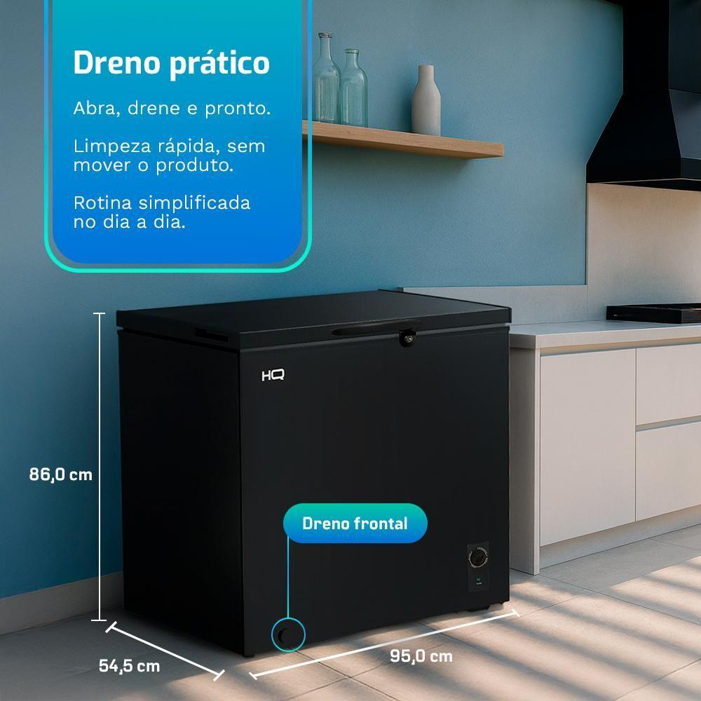 Freezer e Conservador Horizontal HQ 260 Litros Preto HQ-260CFHL 220VFreezer e Conservador Horizontal HQ 260 Litros Preto HQ-260CFHLFreezer Horizontal HQ 260 L: 27,99 kWh por mês, dreno frontal e silêncio de 41 dBMais espaço, menos esforço e custo mensal sob controle. O HQ-260CFHL foi pensado para quem precisa estocar sem complicar a casa.São 260 litros úteis que acomodam compras do mês, carnes porcionadas, sobremesas e bebidas extras, com o que é prioridade sempre ao alcance graças ao cesto organizador. Na manutenção, a rotina também fica fácil, o dreno frontal transforma o degelo em um passo rápido e limpo, basta posicionar um recipiente, abrir e finalizar em poucos minutos. Enquanto isso, o funcionamento silencioso em torno de 41 dB preserva o conforto de cozinhas integradas, áreas gourmet e pequenos comércios. O consumo de 27,99 kWh por mês fecha a conta com inteligência, porque economia recorrente é benefício que se repete. Para acertar na compra, escolha a tensão 127 V ou 220 V. É a solução de capacidade que soma organização e praticidade no dia a dia.Por que isso importa no dia a dia - Menos custo fixo com 27,99 kWh por mês. - Cabe nos seus planos com 260 L e cesto que organiza. - Degelo prático com ralo frontal. - Ambiente mais agradável com baixo ruído. - Compra assertiva em 127 V ou 220 V.Destaques técnicos e funcionais - Capacidade 260 L e degelo manual com dreno frontal. - Cesto organizador removível e refrigerante R600a. - Classe climática T (Tropical) e classe elétrica I. - Ruído ~41 dB. - Consumo ENCE 27,99 kWh/mês em 127 ou 220 V. - Dimensões (L×P×A): 95,0 × 54,5 × 86,0 cm e Peso líquido 32 kg. - Tensão/Frequência: 127 V ou 220 V ~ 60 Hz.Cenários de usoCozinhas e áreas gourmet, apoio para churrascos e festas, pequenos comércios e estoques sazonais.Orientações de usoAguarde cerca de 1 hora após transporte antes de ligar. Use tomada exclusiva e aterrada. Deixe espaço para ventilação. Faça o degelo periódico usando o ralo frontal.Itens na embalagemFreezer HQ-260CFHL, cesto organizador e manual de instruções.Especificações técnicasModelo: HQ-260CFHL (127 V: HQ-260CFHL1 - 220 V: HQ-260CFHL2)Volume útil: 260 LTemperatura do compartimento: -18 °CConsumo (ENCE): 27,99 kWh/mês em 127/220 VRefrigerante: R600aClasse climática: T (Tropical)Classe elétrica: ITensão/Frequência: 127 V ou 220 V ~ 60 Hz (não bivolt)Dimensões e Peso do ProdutoAltura: 86 cmLargura: 95 cmProfundidade: 54,5 cmPeso: 32 KgGarantia01 Ano (Sendo 3 meses de garantia legal e mais 9 meses de garantia para defeito de fabricação).
