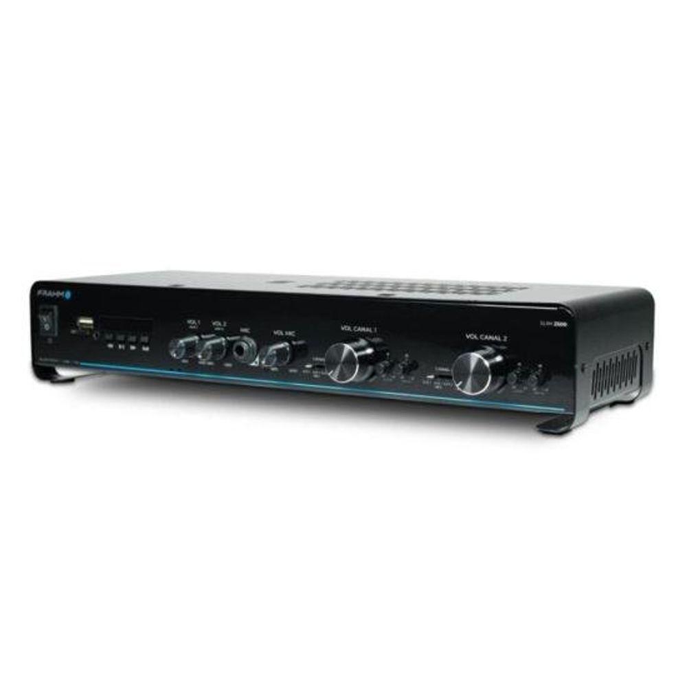Amplificador Frahm Slim 2500 G5 160w RmsO Amplificador Frahm Slim 2500 G5 é um modelo que que faz parte da linha nº1 em amplificadores comerciais do Brasil, agora em sua quinta geração (G5), trazendo ainda mais tecnologia e um visual único. Equipado com Bluetooth 5.0, permite maior alcance e transmissão de dados em alta velocidade. Ideal para uma variedade de espaços, desde restaurantes e lojas até ambientes corporativos e clínicas.Este amplificador é capaz de sonorizar dois ambientes distintos, com músicas diferentes, graças aos seus dois canais independentes, cada um com controle de volume e equalizadores separados.Sensibilidade:do AUX 1: 2x 220m VRMS @ 1KHz Sensibilidade do AUX 2: 2x 250m VRMS @ 1KHz Sensibilidade do MIC: 14m VRMS @ 1KHzPeso:2 KgConsumo de Energia:máximo: 230WCanais:de saída:2Potência:160W RMS (2x 80W) @ 4 OhmsImpedância:do AUX 1: 8K Ohms Impedância do AUX 2: 40K OhmsEntradas:1: USB / FM / MicroSD / BT / P2 Entradas 2: Entrada auxiliar 2x (RCA)Dimensões:(A x L x P): 63 x 385 x 165mmPesquisa:amplificador|amplificador frahm|frahm|amplificador g5|amplificador slim 2500|amplificador slim - Amplificador: Classe AB - Conexões para microfone: 1x (P10) - Bivolt automático: 90-240V Conteúdo da Embalagem: - 01 Amplificador Slim 2500 G5 - 01 Controle remoto para o dispositivo - 02 Pilhas AAA - 01 Manual de instruções
