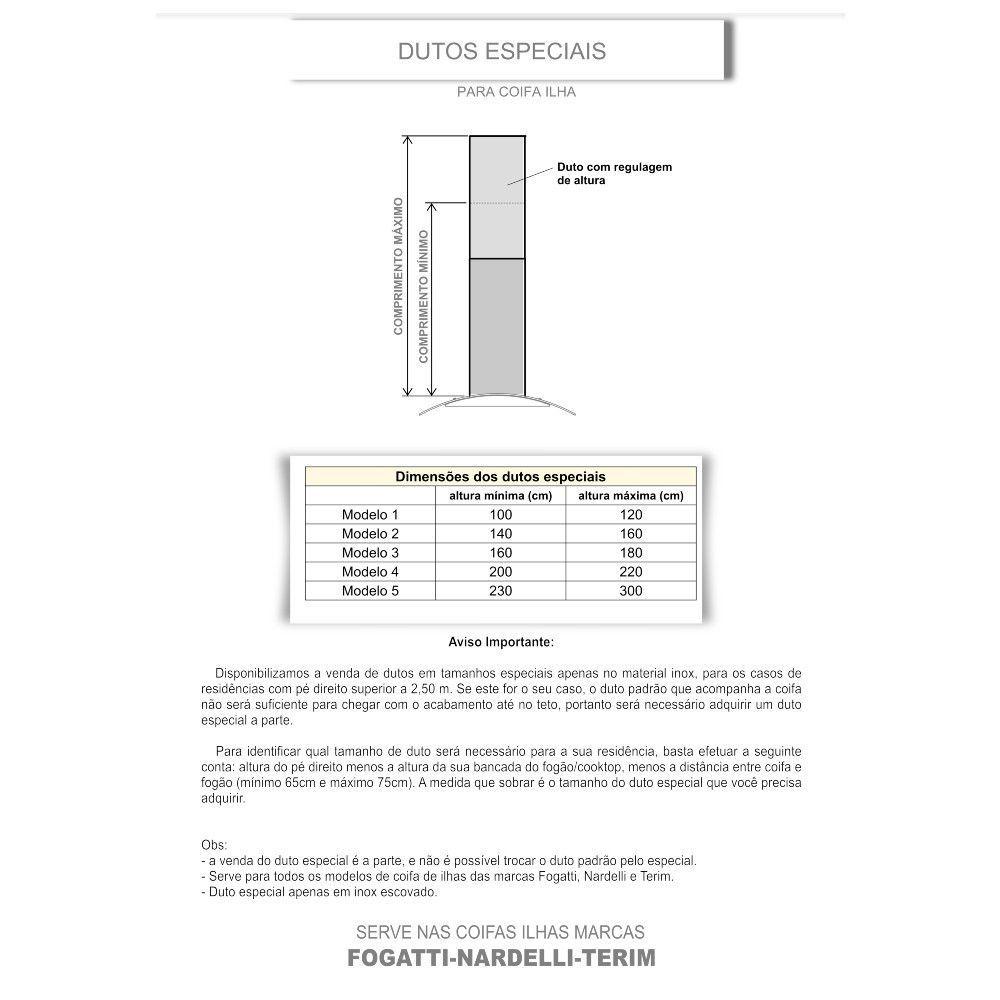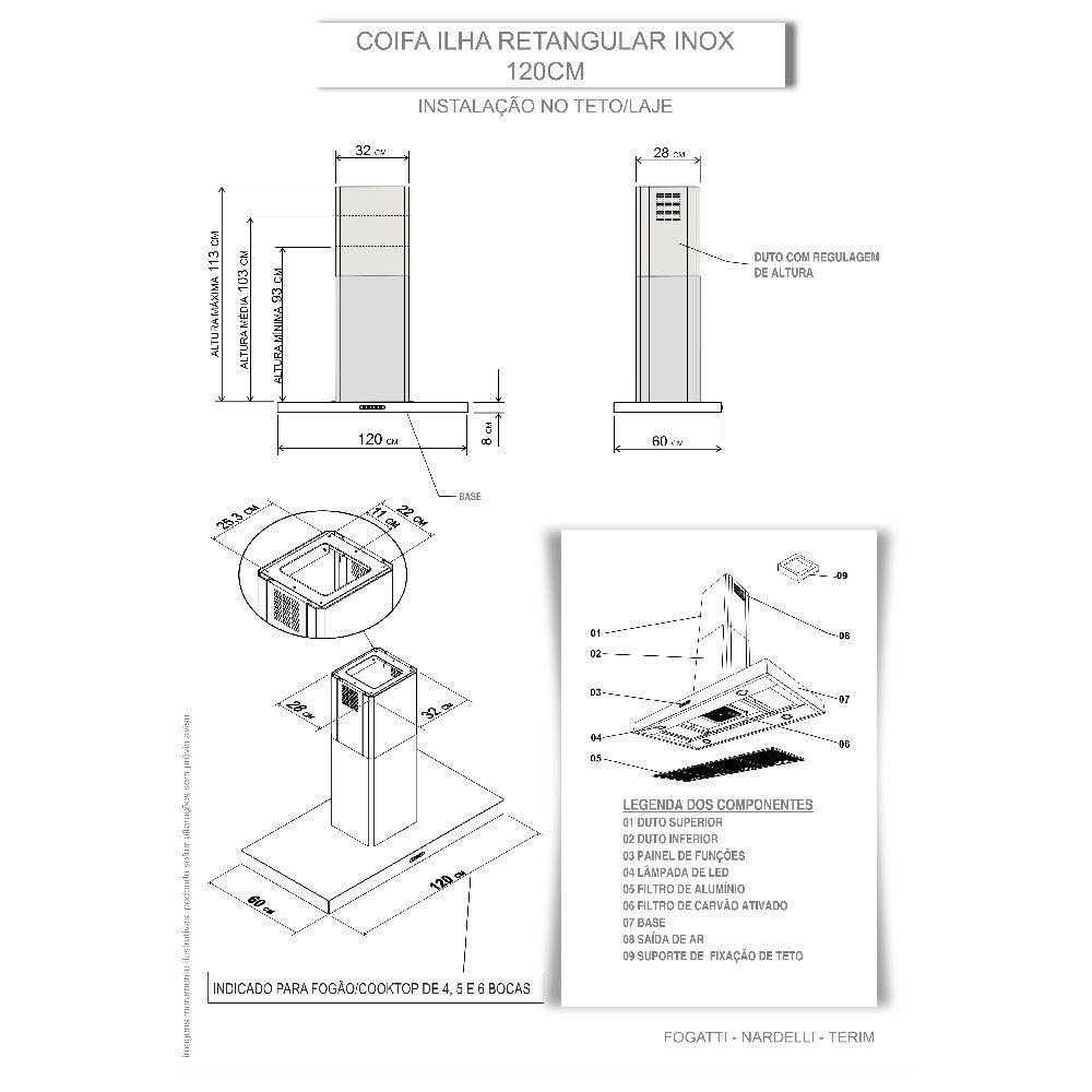 Coifa Retangular Ilha 120cm Fogatti Inox 110vDeixe sua cozinha mais moderna com a Coifa de Ilha Retangular da Fogatti Além de prática e bonita, possui a base e dutos em inox e acompanha filtro de alumínio e filtro de carvão ativado. A coifa pode ser instalada de dois modos distintos, como exaustor ou como depurador. Com design diferenciado, que facilita sua limpeza, iluminação com lâmpadas de led e três velocidades. Traga mais versatilidade para sua cozinha. Para Fogão cooktop de 4 bocas é indicado coifa de 60 ou 70 cm Para Fogão cooktop de 5 bocas é indicado coifa de 75, 80 ou 90 cm Para Fogão cooktop de 6 bocas é indicado coifa de 90 cm ou mais Observação importante, sempre observar a largura do seu fogão, para que a largura da coifa seja sempre um pouco maior que o fogão cooktop Instalação apenas em Ilha, no Teto Atenção escolha a voltagem do produto antes de finalizar a compra Características Função depurador ou exaustor Filtro interno de carvão ativado Filtro externo metálico em alumínio e lavável Painel de funções Easy Touch com 3 velocidades Iluminação com lâmpadas de Led Sucção 1000 m³h no modo depurador e 1100 m³h no modo exaustor Suporte de fixação acompanha a coifa Duto dividido em superior e inferior com regulagem de altura em apenas 3 níveis: mínimo de 93 cm, médio de 103 cm ou máximo de 113 cm. Duto superior possui abertura para ventilação, quando usado no modo depurador Especificações Técnicas Tensão 127V ou 220V, a voltagem deve ser escolhida e selecionada no ato da compra Frequência 60 Hz Ruído 65 dB Potência do motor 400 W Potência total 404 W Velocidades 3 Potência lâmpada 1 W cada uma Consumo 0,244 kWh Dimensões Altura total de 113 cm ou 1,13 metros. Com regulagem de altura em apenas 3 níveis: mínimo de 93 cm, médio de 103 cm ou máximo de 113 cm. Largura 120 cm Profundidade 60 cm Altura base 5,0 cm Peso 35,00 kg Dimensões do duto L 32 cm x P 28 cm, dividido em duas partes Garantia de Fábrica 12 meses Instalação por conta do cliente Imagens meramente ilustrativas Atenção O Tubo sanfonado para exaustão, NÃO acompanha o produto, Vendemos o tubo separadamente. O diâmetro de saída para o mesmo é de 150 mm de circunferência Para cozinhas com pé direito superior a 2,55 m. Temos disponível para venda à parte, alguns tamanhos de dutos especiais. Nas imagens do anúncio disponibilizamos a informação das medidas dos dutos especiais. Sua coifa já vai pronta para utilizar como depurador pois já possui internamente o filtro de carvão ativado. Caso deseje utilizar como exaustor com saída de ar externa, onde será necessário fazer uma abertura na parede, apenas precisará comprar e instalar o tubo sanfonado de alumínio flexível que temos disponível para venda.Cor: Cor Voltagem: Voltagemundefined