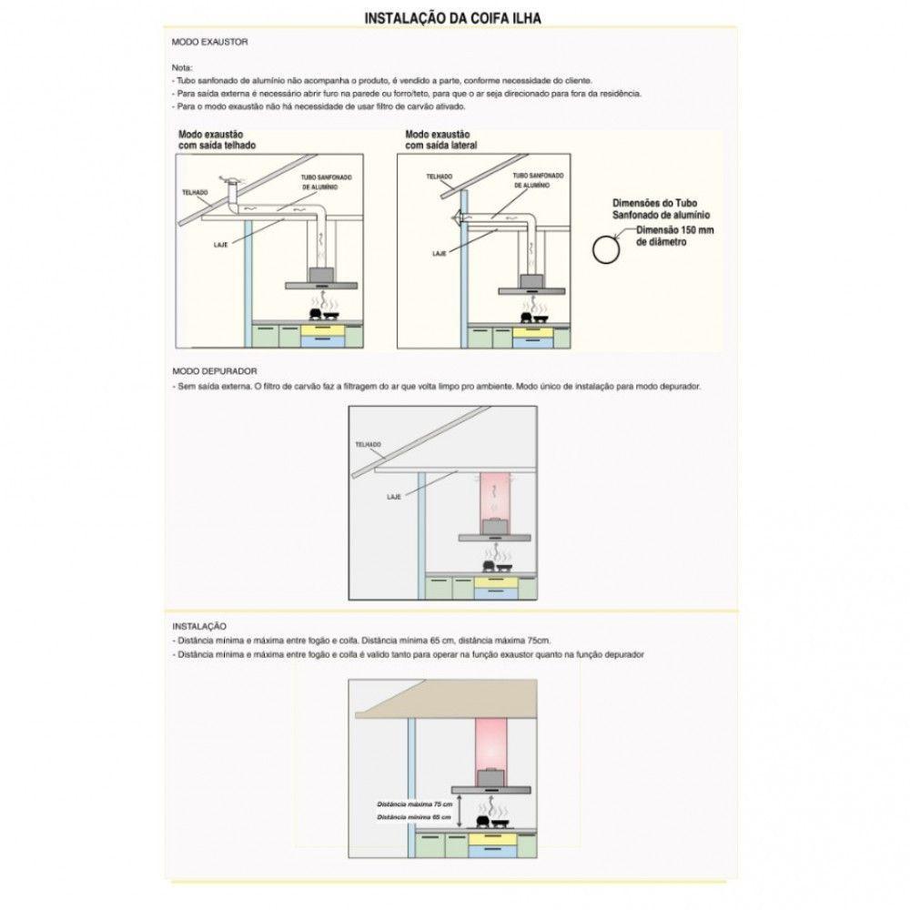 Coifa Ilha 90cm Vidro Reto 3 Velocidades Inox Nardelli Inox 220vDeixe sua cozinha mais moderna com a Coifa de Ilha Vidro Reto da Nardelli Além de prática e bonita, possui a base e dutos em inox e acompanha filtro de alumínio e filtro de carvão ativado. A coifa pode ser instalada de dois modos distintos, como exaustor ou como depurador. Com design diferenciado, possui vidro reto e temperado, que facilita sua limpeza, iluminação com lâmpadas de led e três velocidades. Traga mais versatilidade para sua cozinha. Para Fogão cooktop de 4 bocas é indicado coifa de 60 ou 70 cm Para Fogão cooktop de 5 bocas é indicado coifa de 75, 80 ou 90 cm Para Fogão cooktop de 6 bocas é indicado coifa de 90 cm ou mais Características Função depurador ou exaustor Filtro interno de carvão ativado Filtro externo metálico em alumínio e lavável Painel de funções Easy Touch com 3 velocidades Iluminação com lâmpadas de Led Sucção 700 m3h no modo depurador e 900 m3h no modo exaustor Suporte de fixação acompanha a coifa Duto dividido em superior e inferior com regulagem de altura. mínimo 65 cm e máximo 85 cm de duto. Se considerar a a base da coifa, chega a altura total de 90 cm. Duto superior possui abertura para ventilação, quando no modo depurador Tensão 127V ou 220V, a voltagem deve ser escolhida e selecionada no ato da compra Frequência 60 Hz Ruído 65 dB Potência do motor 240 W Potência total 244 W Velocidades 3 Potência lâmpada 1 W cada uma Consumo 0,244 kWh Dimensões Altura: com regulagem entre 65 cm e 90 cm Largura: 90 cm Profundidade: 60 cm Altura base: 5,0 cm Largura base: 55,5 cm Profundidade base: 36,5 cm Peso 29,90 kg Dimensões do duto: Largura: 32 cm Profundidade: 28 cm, dividido em duas partes Garantia do fornecedor: 12 meses Observações: Sempre observar a largura do seu fogão, para que a largura da coifa seja sempre um pouco maior que o fogão cooktop Instalação apenas em Ilha, no Teto Atenção escolha a voltagem do produto antes de finalizar a compra Instalação por conta do cliente Imagens meramente ilustrativas O Tubo sanfonado para exaustão, não acompanha o produto, Vendemos o tubo separadamente. O diâmetro de saída para o mesmo é de 150 mm de circunferência As dimensões do produto podem sofrer uma pequena variação de largura do vidro, de até 7 sete milímetros. Por este motivo, quando a coifa for instalada de forma embutida em nichos, o fabricante recomenda que seja considerada uma folga de pelo menos 1 cm em cada lado Para cozinhas com pé direito superior a 2,55 m. Temos disponível para venda à parte, alguns tamanhos de dutos especiais. Nas imagens do anúncio disponibilizamos a informação das medidas dos dutos especiais. Sua coifa já vai pronta para utilizar como depurador pois já possui internamente o filtro de carvão ativado. Caso deseje utilizar como exaustor com saída de ar externa, onde será necessário fazer uma abertura na parede, apenas precisará comprar e instalar o tubo sanfonado de alumínio ível que temos disponível para Inox Voltagem: 220V