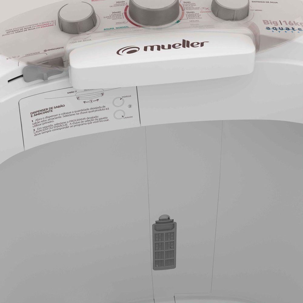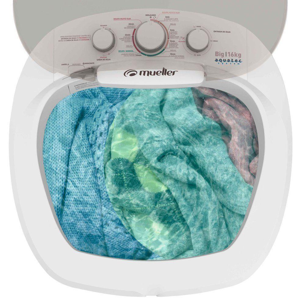 Tanquinho Mueller Big 16kg Semiautomático Branco 110VO Tanquinho Mueller Big com capacidade de 16 kg e uma otima opcao para facilitar o seu dia a dia. O produto permite lavar qualquer tamanho de edredons e cobertores, inclusive o king size. Alem disso, seu controle de drenagem no painel possibilita liberar a saida de agua sem precisar se abaixar. Com o exclusivo filtro por coluna dagua, as roupas ficam livres de fiapos. O modelo ainda possui dispenser medidor com compartimentos para sabao em po ou liquido e amaciantes. Conta ainda com 7 programas de lavagem e Timer. O Tanquinho Big e uma maquina de lavar semiautomatica que possui classificacao A pelo Inmetro, o que comprova sua grande eficiencia e economia. Compre ja o seu!Caracteristicas: Modelo: Big Tipo: Semi-automatica Capacidade: 16 kg Capacidade de agua na cuba: 127 litros Programas de lavagem: 7 Nao possui programa de centrifugacao Sistema de drenagem: Sim Niveis de agua: 3 niveis Timer: Sim Lava edredons: Sim, de casal tamanho King Dispenser: Sabao em po e amaciante Filtro pega-fiapos: Sim Potencia: 395 watts Classificacao Energetica: A Consumo de energia: 0,11 kW/h Dimensoes: Altura: 96,00 cm Largura: 57,00 cm Profundidade: 58,00 cm Peso: 11,40 kg Altura da embalagem:84,00 cm Largura da embalagem: 58,00 cm Profundidade da embalagem: 58,00 cm Peso com embalagem: 13,10 kg Garantia do fornecedor: 12 meses