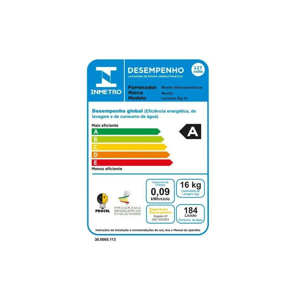 Lavadora Semiautomática Big 16kg Mueller Preto 220VA Lavadora Big 16 Kg possui a maior capacidade da categoria, lavando ate edredons king-size. Possui o exclusivo Aquatec System que possibilita controlar a entrada e saida de agua pelo painel, alem de tres niveis de agua e e o unico que nao transborda. O exclusivo BigFilter - filtro para fiapos por coluna d’agua faz com que toda a agua passe pelo filtro, eliminando os indesejaveis fiapos em qualquer nivel de agua. Possui dispenser para sabao em po e amaciante com medidor e seletor, que permite o despejo do amaciante no momento certo e timer com 7 programas que indicam o tempo de lavagem para suas pecas. Possui classificacao “A” pelo INMETRO e sao os mais economicos com relacao a energia e agua da categoria.Caracteristicas: Nao possui programa de centrifugacao Capacidade de agua na cuba (nivel max.): 127 Consumo de energia (ciclo de lavagem normal) (kW/h): 0,11 Eficiencia de lavagem: 0,78 Classificacao Energetica: A Capacidade de roupa seca (Kg): 16 Dimensoes: Altura: 96 cm Largura: 57 cm Profundidade: 58 cm Peso: 11,4 kg Garantia do Fornecedor: 12 Meses