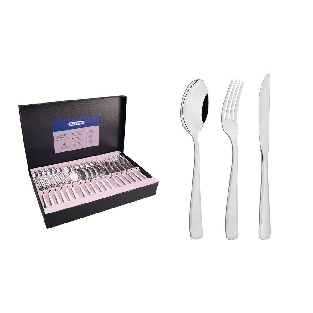 Faqueiro Tramontina Pacific 36 PeçasDESCRIÇÃO:Aprimore seus momentos de apreciação de um bom churrasco com o Faqueiro Tramontina Pacific em Aço Inox com Facas para Churrasco Acabamento Alto Brilho com Detalhes no Cabo 36 Peças. Este conjunto oferece a combinação perfeita de durabilidade e estética, com talheres produzidos em aço inox que garantem longevidade e qualidade.As colheres possuem bojo em formato simétrico e bordas arredondadas, enquanto os garfos têm dentes polidos na parte interna, oferecendo maior conforto no uso. As facas, totalmente temperadas, proporcionam um fio de corte serrilhado duradouro e resistente à corrosão, sem riscar as porcelanas. O acabamento em alto brilho, juntamente com os detalhes elegantes no cabo, traz um toque de sofisticação à sua mesa.DADOS TÉCNICOS:Material: Aço inox de alta qualidadeAcabamento: Alto brilho com detalhes no caboComposição: 36 peças, incluindo facas para churrascoServiço para 6 pessoasFacas totalmente temperadas com fio de corte serrilhadoColheres com bojo simétrico e bordas arredondadasGarfos com dentes polidos e bordas arredondadasITENS INCLUSOS:6 Colheres de Mesa6 Garfos para Torta6 Garfos de Mesa6 Colheres para Café6 Colheres para Chá6 Facas para Churrasco