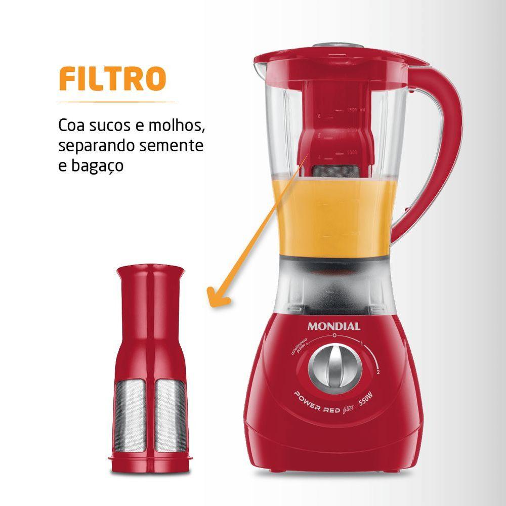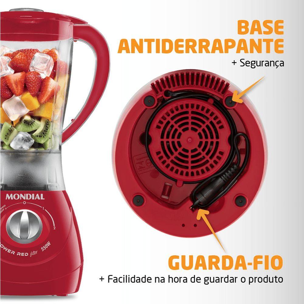 Liquidificador Mondial Turbo Power L-77 Liquidificador-220v-vermelhoCom 550W de potência, copo de 1,9L, além de 4 Velocidades + pulsar, função autolimpeza e lâminas super afiadas, o Power Red Filter L-77 é um liquidificador vermelho de montagem rápida e prática. Com potência de 550W, ele tem melhor desempenho nas receitas do dia a dia, como sucos, vitaminas, bolos, sopas e patês. Seu copo de 1,9 L é resistente a quedas e riscos e não pega cheiro. Ele tem 2 velocidades + pulsar, para uma mistura mais rápida. E ele ainda tem a função autolimpeza, facilitando na hora de limpar! Graças ao seu filtro, entra a fruta, e sai o suco ou molho pronto, sem semente. Já a base antiderrapante traz mais segurança e seu guarda-fio faz o liquidificador caber perfeitamente no seu armário.O Liquidificador Power Red Filter L77 foi desenvolvido para uso doméstico, sendo melhor para uso residencial. Tudo isso com 1 ano de garantia Mondial.Modelo - L-77Cor - VermelhoVoltagem (Tensão) - 127V/220VItens inclusos - 01 Liquidificador - Manual de InstruçõesMaterial do copo - PPCapacidade (Total) - 1,9LCapacidade (Útil) - 1,2LPotência - 500WVelocidades - 2 VelocidadesFunção pulsar - SimFunção auto-limpeza - SimFiltro - SimDimensões do produto - 40cm x 21cm x 20cm (AxLxP)Peso do produto - 1,250kgGarantia - 1 ano