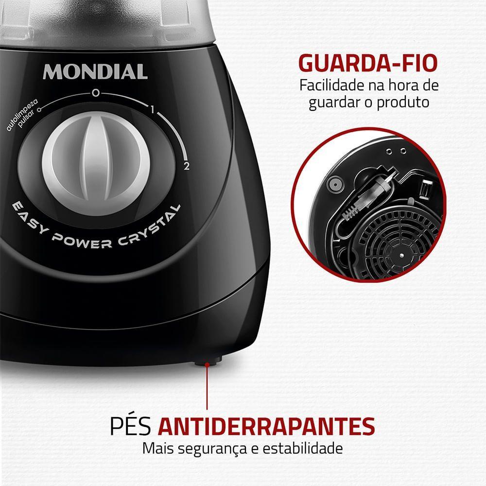 Liquidificador Easy Power Mondial Preto 550W L-550-BC 110VO Liquidificador Mondial Easy Power Crystal é um aliado indispensável na cozinha. Com 550W de potência, copo transparente de 1,9 litros e faca de aço inox, ele tritura facilmente diversos ingredientes, como frutas, legumes e grãos. Possui duas velocidades, além da função pulsar, e uma tampa com copo dosador que facilita a adição precisa de ingredientes. Ideal para preparar sucos, vitaminas, bolos, molhos e muito mais.Diferenciais do Produto:Capacidade Total de 1,9 Litros: Prepare sucos, vitaminas, smoothies, molhos e diversas outras receitas com praticidade, na porção ideal que você precisa.Capacidade Útil de 1,5 Litros.2 Velocidades + Pulsar: Ajuste a velocidade conforme a receita e use a função pulsar para triturar ingredientes mais duros com eficiência.Copo de San Cristal: Transparente e resistente a temperaturas de até 80°C, facilita a visualização dos ingredientes durante o preparo.Faca em Aço Inox: Tritura com mais precisão e rapidez, sem enferrujar. Mais resistência e durabilidade.Potência de 550W: Permite que você misture ou triture suas receitas com maior agilidade.Tampa com Copo Dosador: Facilita o acréscimo de ingredientes durante o preparo.Função Autolimpeza: Auxilia na limpeza do copo e, em especial, das lâminas.Jarra BPA Free e Sem Cheiro: Livre de Bisfenol-A, substância prejudicial à saúde. O material não absorve nem transfere cheiros, preservando o sabor das bebidas.Guarda-Fio e Porta-Plug: Mais facilidade para enrolar o fio, deixando o armazenamento mais fácil e organizado.Um Ano de Garantia Mondial: A Mondial é a escolha de milhões de consumidores.Mondial, a escolha inteligente!Especificações Técnicas:Marca: MondialModelo: L-550-BCCor: PretoVoltagem (Tensão): 127V ou 220V (Não é Bivolt)Material do Copo: San CristalCapacidade Total: 1,9LCapacidade Útil: 1,5LPotência: 550WVelocidades: 2 VelocidadesFunção Pulsar: SimFunção Autolimpeza: SimDimensões do Produto: 39cm x 20cm x 17cmPeso do Produto: 1,21kgGarantia: 12 MesesItens Inclusos: 01 Liquidificador; Manual de instruções; Manual de assistência técnica