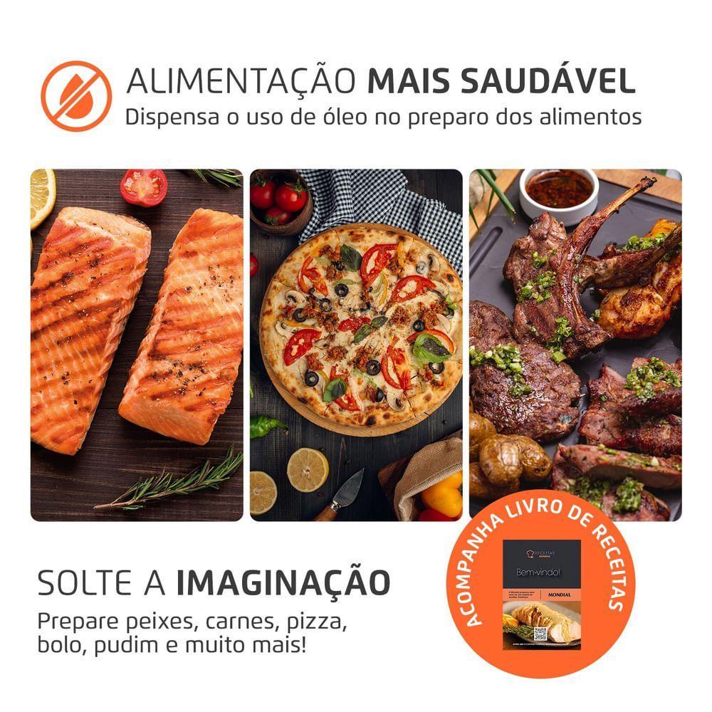 Air Fryer Forno 25L French Door Mondial Preto/Inox 2000W AFDO-25L-FD 220VA Air Fryer Oven French Door 25L é ideal para quem ama criar diferentes menus na cozinha e valoriza praticidade. Mais do que espaço, ela oferece versatilidade com a divisória Dualzone, para o preparo de mais de uma receita ao mesmo tempo, explorando combinações sem se preocupar com mistura de sabores. A função sincronizar é perfeita para quem quer servir o prato principal e os acompanhamentos juntos.Com a Air Fryer 25L você assa e faz frituras sem a necessidade de usar óleo, mantendo muita crocância e sabor. Suas portas com vidro duplo não apenas trazem um visual sofisticado, mas também são mais seguras e oferecem acesso facilitado aos alimentos. Com a divisória removível, escolha entre porções pequenas, médias ou aproveite toda a capacidade para pratos maiores.Possui painel touch colorido intuitivo e moderno, com 10 funções pré-programadas para assar, grelhar, fazer pães, bolos e muito mais - tudo com um simples toque. O controle de temperatura e o timer de 90 minutos ajustáveis permitem elaborar receitas com mais precisão. O design moderno em inox traz elegância, enquanto o visor amplo e a iluminação interna oferecem mais controle no acompanhamento dos alimentos.Potente, versátil e inteligente, a AFDO-25L-FD é ideal para refeições completas e sem complicações!Capacidade de 25 Litros: Espaço sob medida para lasanhas, assados e pizzas de até 28 cm. Ideal para quem busca praticidade e eficiência ao cozinhar grandes porções de uma só vez.Divisória Dualzone Removível: Possibilita ter duas zonas de cozimento independentes, com ajustes personalizados de tempo e de temperatura.Função Sincronizar: Você pode programar o prato principal e os acompanhamentos para ficarem prontos juntos, mesmo que tenham tempos diferentes de preparo.Porta French Door: Design francês elegante e funcional, com dupla abertura que facilita o acesso aos alimentos, permitindo abrir apenas um dos lados por vez.Painel Touch Colorido: Prático e intuitivo, o painel propicia ajustes precisos para ótimos resultados, além de 10 funções predefinidas para diferentes tipos de pratos.Potência: Conta com 2.000W em 127V e 2.200W em 220V, para desempenho ágil e resultados mais uniformes.Iluminação Interna + Amplo Visor: Para visualizar facilmente as receitas durante todo tempo de elaboração.Praticidade e Economia: Possui controle de temperatura até 220°C e timer de até 90 minutos. O desligamento automático com sinal sonoro, ao fim do preparo, ajuda a economizar energia e oferece tranquilidade para realizar outras tarefas.Alimentação Mais Saudável: Esqueça o óleo! Elabore pratos saborosos e leves para uma alimentação equilibrada e com menor consumo de gordura.Vá Além da Batata Frita: Faça carnes, frangos, peixes, legumes, pizzas e até sobremesas como bolos, cookies e cupcakes.10 Acessórios Indispensáveis: A AFDO-25L-FD vem acompanhada de 1 assadeira tipo cesto, 1 assadeira antiaderente, 1 suporte para formas, 2 assadeiras perfuradas, 2 assadeiras fechadas, 1 divisória removível, 1 puxador e 1 luva de silicone.Um Ano de Garantia Mondial: A Mondial é a escolha de milhões de consumidores. Mondial, a escolha inteligente!Marca: MondialModelo: AFDO-25L-FDCor: Preto / InoxItens inclusos: 01 Fritadeira; 02 Assadeiras pequenas perfuradas; 02 Assadeiras fechadas; 01 Suporte para formas; 01 Assadeira grande; 01 Bandeja coletora; 01 Divisória; 01 luva de silicone; 01 puxador; 01 livro de receitas e 01 Manual de instruçõesCapacidade: 25LPotência: 2000W (127V) / 2200W (220V)Temperatura: Até 200ºCTimer: 90 minutosAção do produto: Assa, grelha e frita sem óleo com ar quente. Possui Dualzone para duas receitas ao mesmo tempo e função sincronizar para deixá-las prontas juntas.Tipo de alimentos que comporta: Carnes, frangos, peixes, legumes, lasanhas, pizzas de até 28 cm, pães, bolos, cookies, cupcakes, batatas fritas, empanados, assados e sobremesas.Revestimento antiaderente: SimSegurança: Vidro duplo, French Door, desligamento automático, alarme sonoro, painel touch, luz interna, divisória segura, pés antiderrapantes.Tipo de fritadeira: OvenLuz indicadora: SimDimensões do produto: 39,5cm x 40cm x 40cm (AxLxP)Peso do produto: 11,6KgTipo de tomada (amperes): 20AGarantia: 12 meses