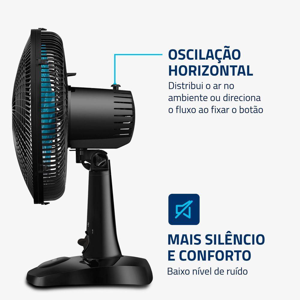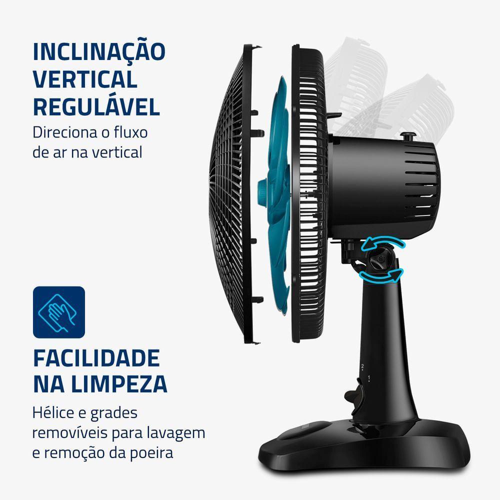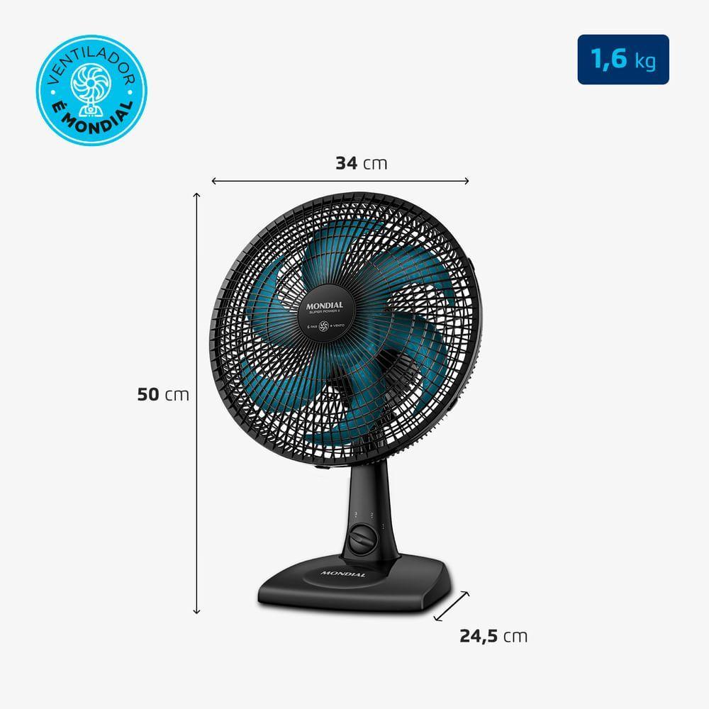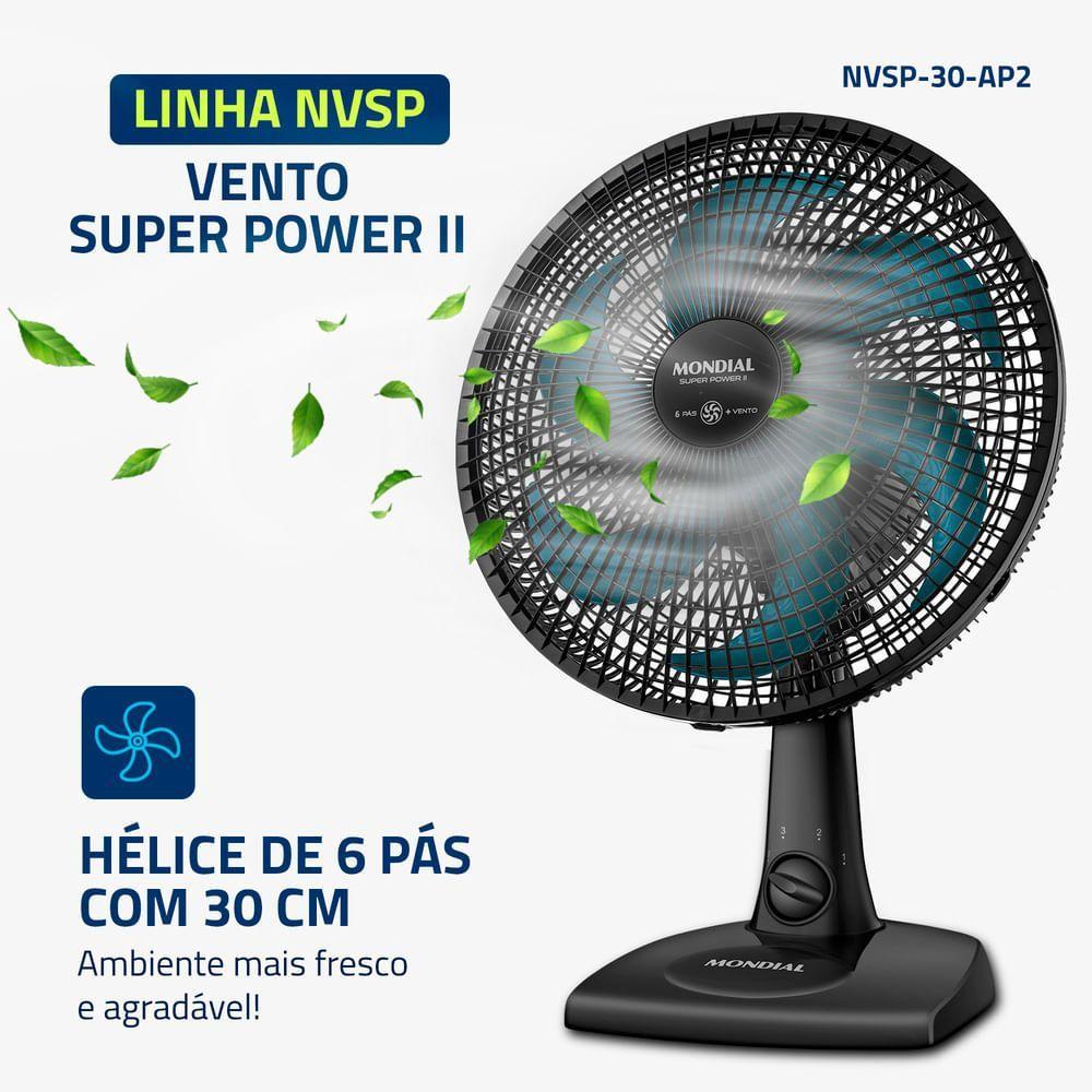 Ventilador De Mesa 30cm Super Power Ii Mondial Preto/azul Petróleo 60W NVSP-30-AP2 110VO Ventilador Mondial Super Power II NVSP-30-AP2 oferece conforto e desempenho com design moderno.Com 30 cm de diâmetro e hélice de 6 pás, garante fluxo de ar intenso para ambientes mais frescos e agradáveis.O sistema de oscilação horizontal amplia o alcance da ventilação, enquanto a inclinação vertical regulável direciona o vento com precisão para cima ou para baixo.Conta ainda com 3 opções de velocidade (mínima, média e máxima), adaptando-se a diferentes momentos do dia.As grades frontal e traseira, juntamente com a hélice, são removíveis, facilitando a limpeza e manutenção. O design compacto e a alça de transporte permitem levar o aparelho facilmente entre os cômodos.Mondial é a escolha inteligente para quem busca potência, praticidade e conforto no dia a dia.Destaques do ProdutoVento Super Power: 30 cm de diâmetro e 6 pás, proporcionando maior intensidade do vento.Mais Silêncio: Baixo nível de ruído para conforto durante estudos, trabalho ou sono.Oscilação Horizontal: Amplo raio de alcance ou opção de ar direcionado.Inclinação Vertical Regulável: Direcionamento preciso do fluxo de ar.Controle de Velocidade: 3 velocidades (mínima, média e máxima).Facilidade na Limpeza: Grades e hélice removíveis.Alça de Transporte: Praticidade para levar entre diferentes ambientes.Um Ano de Garantia Mondial.Especificações TécnicasModelo: NVSP-30-AP2Marca: MondialTipo: Ventilador de MesaCor: Preto e Azul PetróleoCor das pás: Azul PetróleoDiâmetro: 30 cmQuantidade de pás: 6Potência: 60WNúmero de velocidades: 3 (mínima, média e máxima)Oscilante: SimInclinação regulável: SimColuna ajustável: NãoControle remoto: NãoVoltagem: 127V ou 220V (Não é Bivolt)Dimensões (AxLxP): 49 cm x 35 cm x 24,5 cmPeso: 1,7 kgGarantia: 1 anoConteúdo da Embalagem01 Ventilador de Mesa Mondial NVSP-30-AP201 Manual de Instruções