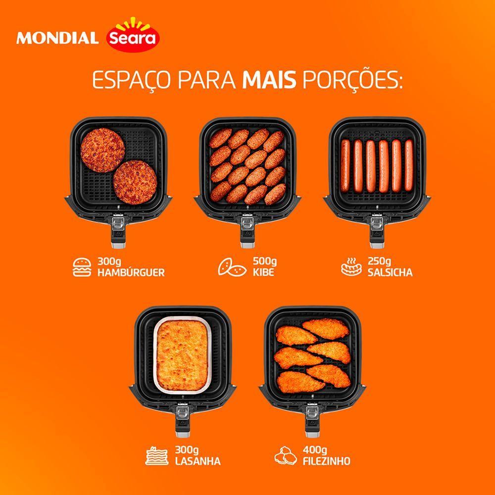 Fritadeira Sem Óleo Air Fryer Mondial AFN-40-TBS 110VAir Fryer Mondial Family 4L – AFN-40-TBSA Air Fryer Mondial Family 4L é ideal para o dia a dia, oferecendo sabor, crocância e muito mais praticidade para suas receitas. Com cesto quadrado de 4 litros, você tem espaço ideal para preparar desde petiscos até refeições completas para toda a família. Ela assa, frita e cozinha sem necessidade de óleo, garantindo alimentos mais saudáveis e saborosos.O timer de 60 minutos e o desligamento automático oferecem mais segurança, enquanto o revestimento antiaderente Duraflon facilita a limpeza. Seu design moderno com acabamento em inox traz sofisticação para a sua cozinha.DiferenciaisCapacidade de 4 Litros: Cesto quadrado com a maior área plana da categoria*, acomoda melhor os alimentos, evita empilhar e garante cozimento por igual.*Comparativo realizado com todos os modelos de Air Fryer 4L disponíveis no mercado até outubro/2023.Cesto Removível: Facilita a retirada dos alimentos, pode ser colocado na lava-louças e torna a limpeza mais prática.Antiaderente Duraflon: Mais eficiência e durabilidade, evitando que os alimentos grudem no fundo.Potência de 1.500W: Aquece rapidamente e prepara alimentos em menos tempo.Design Compacto: Ocupa menos espaço na bancada e nos armários.Tecnologia de Circulação de Ar Quente: Proporciona cozimento uniforme, deixando os alimentos macios por dentro e crocantes por fora.Alimentação Mais Saudável: Dispensa o uso de óleo, promovendo refeições mais leves.Controle de Temperatura até 200°C: Ajuste ideal para diferentes tipos de alimentosVersatilidade: Permite preparar carnes, frangos, peixes, legumes e até sobremesas como bolos, cupcakes e cookies.Facilidade na Limpeza: Evita gordura espalhada e cheiro de fritura, deixando a cozinha organizada.Mais Praticidade: Timer de 60 minutos com desligamento automático e aviso sonoro, permitindo que você realize outras tarefas enquanto prepara suas receitas.Garantia de 1 Ano: Mondial, a escolha inteligente de milhões de consumidores.Especificações TécnicasModelo: AFN-40-TBSCapacidade: 4 LitrosPotência: 1.500WTemperatura: Até 200°CTimer: 60 minutosFunções: Assar, cozinhar, gratinar e fritarTipo de alimentos: Petiscos, massas, carnes, pastéis, pão de queijo, churros, peixes e muito maisRevestimento Antiaderente: Sim (Duraflon)Segurança: Aviso sonoro e desligamento automáticoLuz Indicadora: SimTipo de Fritadeira: ElétricaVoltagem (Tensão): 127V ou 220V (Não é Bivolt)Tipo de Tomada: 127V (20A) / 220V (10A)Cor: Preto/LaranjaDimensões [AxLxP]: 33 x 29,7 x 37,7 cmPeso: 4,50 kgGarantia: 1 AnoMarca: MondialItens Inclusos01 Air Fryer Mondial Family 4L AFN-40-TBS01 Livro de Receitas01 Manual de Instruções