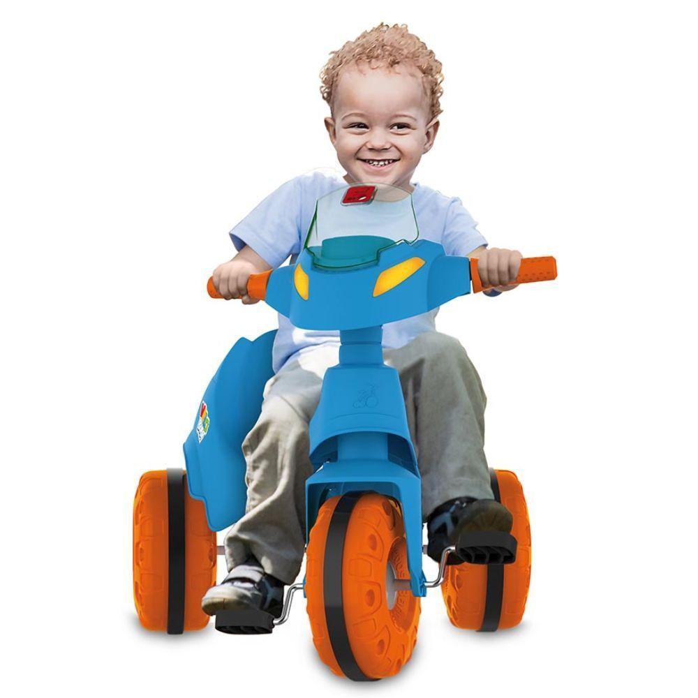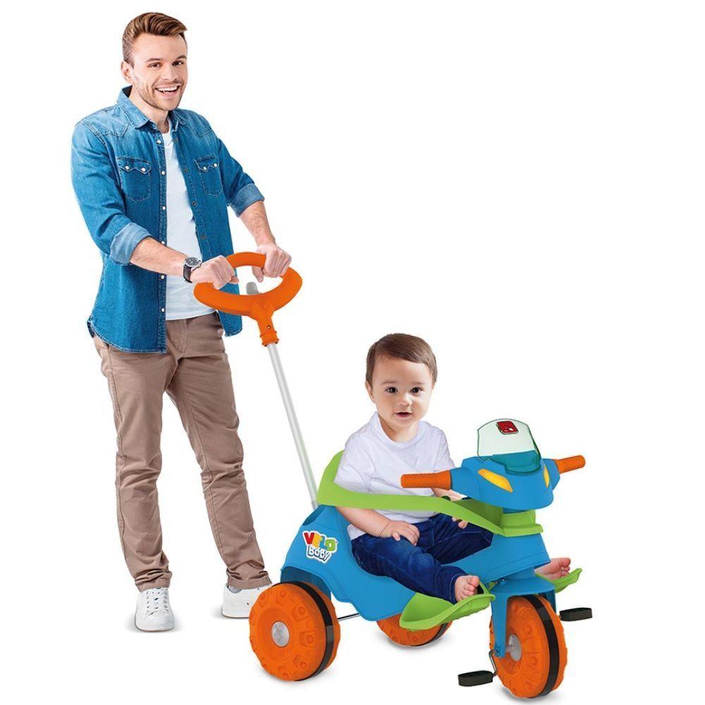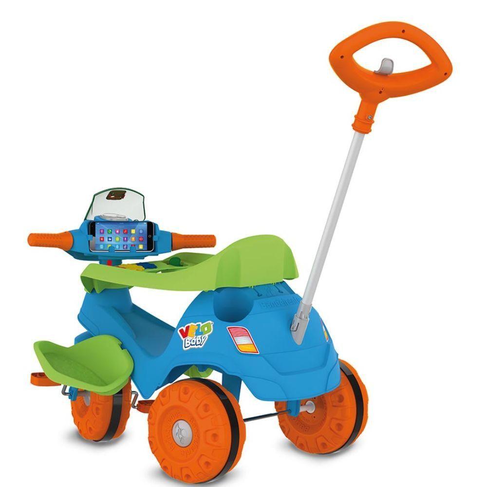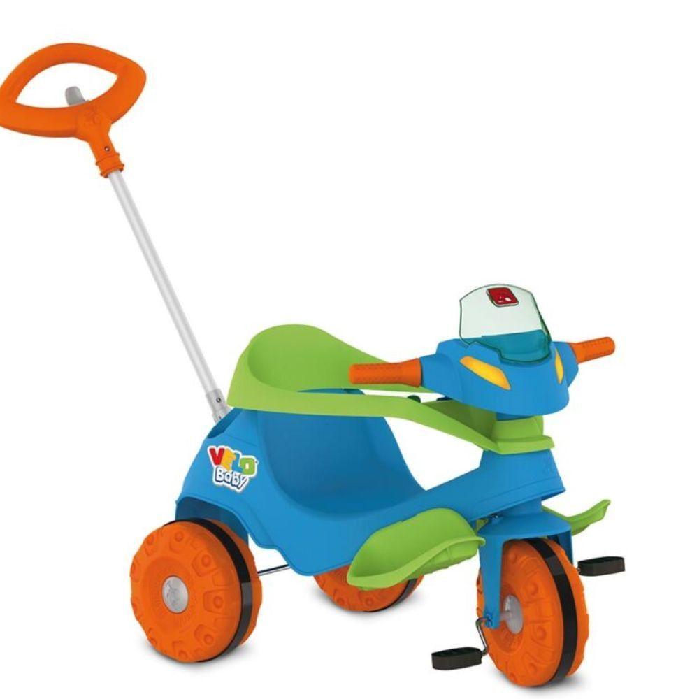 Triciclo Bandeirante Velobaby Passeio AzulUm triciclo com duas funcoes, pratico e moderno para o adulto e divertido para as criancas!FUNCAO PASSEIO: O adulto utiliza a haste direcionavel para conduzir o triciclo. Basta , colocar o cercado de protecao e o apoio dos pes.FUNCAO PEDAL: Permite a crianca pedalar livremente como um triciclo convencional. Basta remover a haste, o cercado de protecao e o apoio dos pes.Haste direcionavel e removivelRodas com anel antiderrapanteAssento anatomicoSuporte para garrafa dagua, mamadeira ou squeeze (no corpo do produto)Apoio para os pes removivel: Mantem os pes da crianca apoiados confortavelmenteSuporte para bolsa/ sacola (na alca da haste)Guidao com porta celularCercado de protecao removivel com painel de atividadesIdade: +12 mesesPeso maximo suportado: 30kgDimensoes do produto:Altura: 102 cmLargura: 54,5 cmProfundidade: 96,5 cmPeso: 4,72 kgGarantia: 3 meses