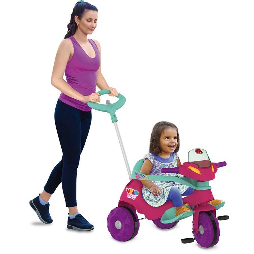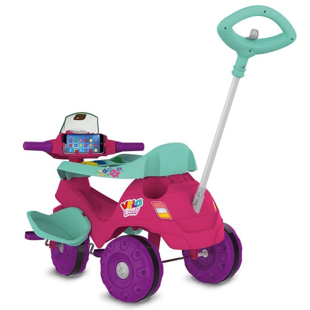 Triciclo Bandeirante Velobaby Passeio RosaUm triciclo com duas funcoes, pratico e moderno para o adulto e divertido para as criancas!FUNCAO PASSEIO: O adulto utiliza a haste direcionavel para conduzir o triciclo. Basta , colocar o cercado de protecao e o apoio dos pes.FUNCAO PEDAL: Permite a crianca pedalar livremente como um triciclo convencional. Basta remover a haste, o cercado de protecao e o apoio dos pes.Haste direcionavel e removivelRodas com anel antiderrapanteAssento anatomicoSuporte para garrafa dagua, mamadeira ou squeeze (no corpo do produto)Apoio para os pes removivel: Mantem os pes da crianca apoiados confortavelmenteSuporte para bolsa/ sacola (na alca da haste)Guidao com porta celularCercado de protecao removivel com painel de atividadesIdade: +12 mesesPeso maximo suportado: 30kgDimensoes do produto:Altura: 102 cmLargura: 54,5 cmProfundidade: 96,5 cmPeso: 4,72 kgGarantia: 3 meses