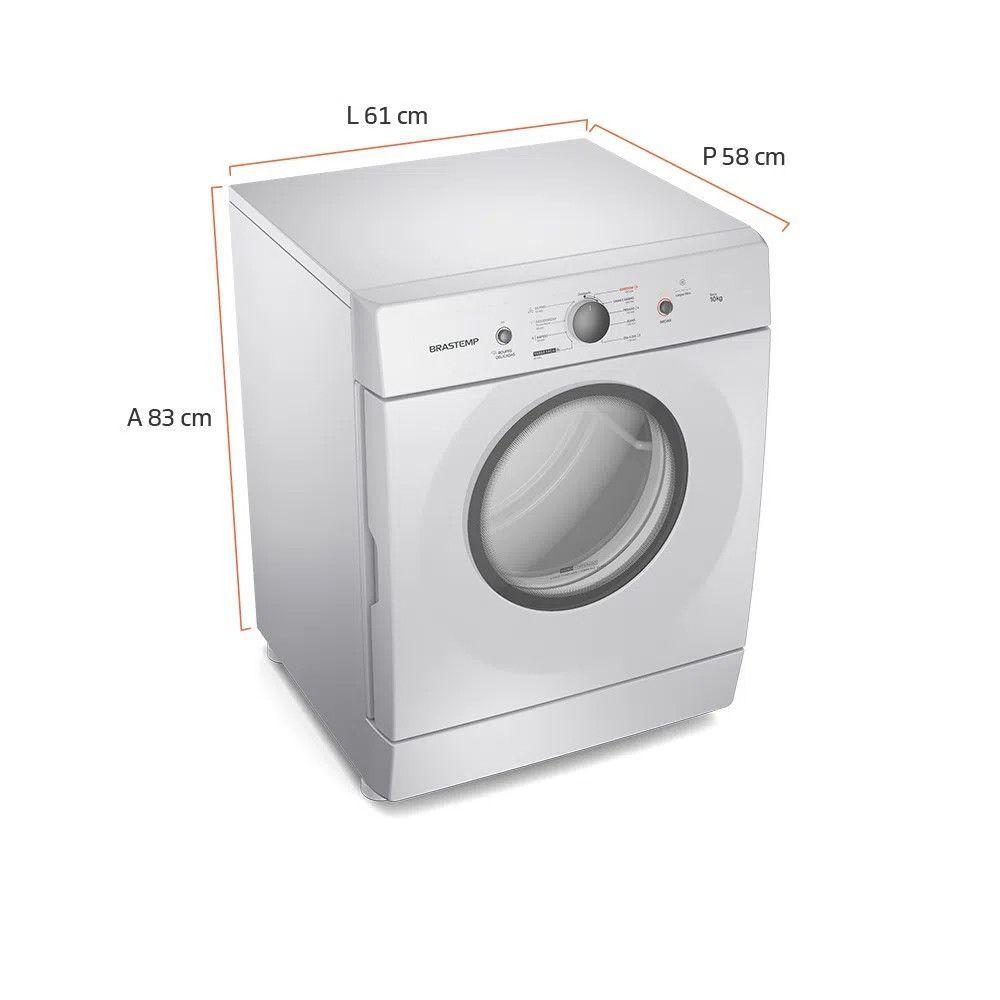 Secadora Brastemp Piso 10kg Branco 220VLinha de Secadoras Brastemp ... Secagem no tempo ideal que garante roupas mais faceis de passar. Ciclo desodorizar com jato de ar que suaviza odores indesejaveis. Seca todo tipo de roupa, ate o edredomPotencia: 2000WDimensoesAltura: 83 cmLargura: 61 cmComprimento: 58cmPeso: 40 kgGarantia: 12 meses