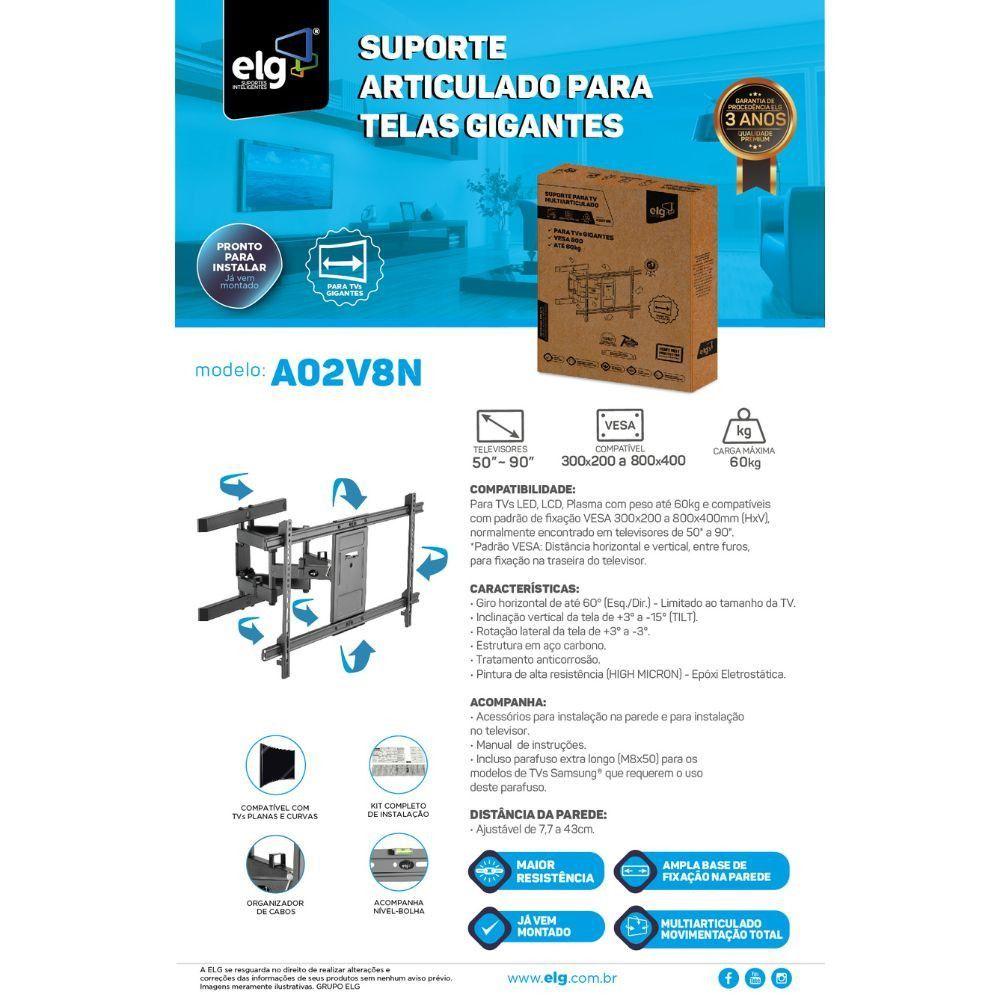 Suporte Multiarticulado Vesa 800 De 50 A 90 Elg PretoLeve sua experiencia de entretenimento a outro nivel com o Suporte Elg Multiarticulado VESA 800, ideal para TVs de 50 a 90.Fabricado com materiais de alta resistencia, ele garante seguranca, estabilidade e praticidade para o seu ambiente. Com design robusto e moderno, o suporte permite ajustes de inclinacao, rotacao e afastamento da parede, proporcionando o melhor angulo de visao em qualquer espaco. Compativel com o padrao VESA ate 800x400mm, e perfeito para residencias, escritorios e salas de reuniao. Instalacao simples, gestao de cabos embutida e acabamento premium fazem do Suporte Elg a escolha certa para quem busca qualidade, durabilidade e versatilidade. Caracteristicas: Marca: Elg Modelo: Multiarticulado Carga Max: 60kg Distancia TV: 7,7 a 43cm Fabricacao: Aco carbono Giro Horizontal: 60 Ajuste de Nivel: +3 a -3 Inclinacao Vertical: 3+ a -15 Padrao VESA: 300x200 a 800x400 Pintura: Epoxi Eletrostatica Polegadas: 50 a 90 Tipo: Articulado Tipo TV: LED, LCD, Plasma Tratamento Superficial: Anticorrosao Conteudo da Embalagem: 01 Suporte Multiarticulado Vesa 800 de 50 A 90 Elg Dimensoes: Altura: 44,6 cm Largura: 8,5 cm Profundidade: 34,8 cm Peso: 8,77 Kg Garantia do Fabricante: 12 meses