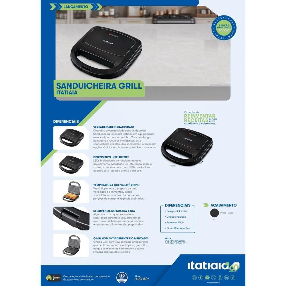 Sanduicheira Itatiaia Essencial Preto 220VGrill e Sanduicheira Elétrica Itatiaia Essencial - PretoPrepare suas refeições com praticidade e eficiência com o Grill e Sanduicheira Elétrica Essencial da Itatiaia. Com um design moderno e funcionalidades que facilitam o dia a dia, ele é a escolha perfeita para preparar lanches rápidos e grelhados saborosos na sua cozinha.Principais Características:Alta Potência de 750W: Garante um aquecimento rápido e um preparo eficiente, grelhando e tostando seus alimentos de maneira uniforme.Chapa Grill Antiaderente: As chapas com ondulações deixam aquelas marquinhas de grill e, por serem antiaderentes, evitam que os alimentos grudem, facilitando muito a limpeza.Segurança e Praticidade: Conta com uma alça com trava de segurança, que garante um fechamento perfeito e mais segurança durante o uso. Os LEDs indicadores mostram quando o aparelho está ligado e quando atingiu a temperatura ideal.Temperatura de até 200°C: Atinge a temperatura ideal para preparar uma grande variedade de receitas com precisão, desde sanduíches até pequenos grelhados.Especificações Técnicas:Marca: ItatiaiaModelo: EssencialVoltagem: 220VTipo: Sanduicheira e Grill ElétricoPotência: 750WTemperatura Máxima: 200°CChapas: Grill AntiaderenteCor: PretoPeso: 0,82 kgDimensões [AxLxP]: 7,2 x 21,7 x 21,7 cmGarantia: 12 meses
