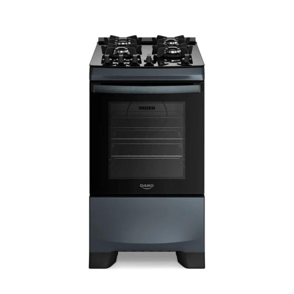 Fogão Dako 4 Bocas Supreme Timer Glass Titanium BivoltFogão Dako 4 Bocas Supreme com Mesa de Vidro e Timer - TitaniumO Fogão Dako Supreme Timer Glass une design, tecnologia e performance para transformar sua cozinha. Com um moderno painel touch, queimador Chama e um forno de 60 litros com limpeza fácil, ele oferece a versatilidade e a potência que você precisa para preparar suas melhores receitas com mais praticidade e elegância.Principais Características:Mesa de Vidro com Queimador Chama: A mesa de vidro temperado é moderna e muito mais fácil de limpar. O potente queimador Chama de 3,0 kW é ideal para panelas maiores e garante mais agilidade no preparo.Grades Individuais de Ferro Fundido: As grades com 6 pontos de apoio oferecem máxima estabilidade e para qualquer tipo de panela, das menores às mais pesadas.Forno de 60L com Limpa Fácil: O forno de boa capacidade possui revestimento que evita o acúmulo de gordura e duas prateleiras deslizantes, tornando o uso e a limpeza muito mais práticos.Timer Digital Touch: Programe o tempo de preparo com o timer digital e controle as funções do forno de forma moderna e intuitiva.Design e Praticidade: O acendimento automático "girou, clicou, acendeu", o puxador em alumínio escovado e os botões removíveis garantem uma experiência de uso mais prática e segura.Especificações Técnicas:Marca: DakoModelo: Supreme Timer GlassVoltagem: Bivolt (para o acendimento e timer)Tipo: Fogão de PisoAlimentação: GásAcendimento: AutomáticoQuantidade de Bocas: 4Queimadores: 1 Chama (3,0kW), 1 Família (2,0kW), 2 Semi-Rápidos (1,7kW)Capacidade do Forno: 60 LitrosMaterial da Mesa: Vidro TemperadoMaterial das Grades: Ferro FundidoCor: TitaniumPeso: 26,3 kgDimensões [AxLxP]: 94,1 x 52,2 x 64,9 cmGarantia: 12 meses