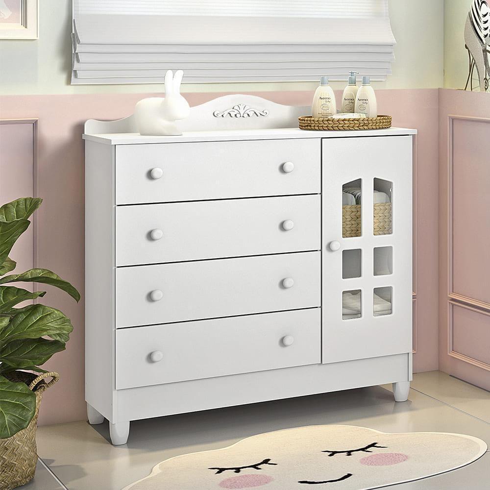 Quarto De Bebê Lisa Provençal Berço Mini Cama Lisa Cômoda Infantil Com Porta Branco Carolina BabyNosso joguinho no estilo provençal além de agregar na decoração do dormitório da criança, traz o selo de certificação do INMETRO, garantindo assim a qualidade e a segurança de nossas peças. Estes produtos se encontram disponíveis nas cores Branco Brilho e Branco Fosco com Amadeirado. INFORMAÇÕES TÉCNICAS DOS PRODUTOS Código DO FABRICANTE: 301169 MODELO: Quarto de Bebê. TIPO DE PINTURA: UV, com acabamento por camadas de verniz foto curado de composição não tóxica. ESTRUTURA DO BERÇO: MDF. REGISTRO DO INMETRO: 009413/2022 GRADES DO BERÇO: MDF. ESTRADO DO BERÇO: Em chapa de MDF de 6 mm, com fixação por parafusos, regulável para 2 posições. MEDIDAS DO BERÇO (CxLxA) cm: 154,8 x 77,9 x 114,3 MEDIDAS DO COLCHÃO (CxLxA) cm: 130 x 70 x 10 ou 12 (Colchão não incluso). SUPORTE P/ MOSQUITEIRO: Sim. KIT RODÍZIOS: Sim. SUPORTA ATÉ (Kg): 60 ESTRUTURA DA CÔMODA: MDF e MDP. MEDIDAS DA CÔMODA MONTADA (CxLxA) cm: 97 x 41 x 102 VAZADO DA PORTA: Chapa de Acrílico com fixação por suportes e parafusos. CORREDIÇA DAS GAVETAS: Gavetas abrem e fecham sobre trilhos metálicos. PUXADORES DAS GAVETAS E/OU PORTA (as): Em PVC (Plástico). MATERIAL DOS PÉS: Em PVC (Plástico), resistente à água. QUANTIDADE DE PRATELEIRA: 1 TRAVA ANTI TOMBAMENTO: Sim. ADVERTÊNCIAS: Não nos responsabilizamos pela montagem dos produtos. A tonalidade da cor do produto pode variar entre a imagem de exibição do site e o item físico. Leia atentamente todas as instruções de montagem contidas no manual de montagem do produto antes de iniciar a montagem do produto. Guarde este documento para futuras utilizações. Consequências pela não observação e seguimento das advertências aqui descritas são de inteira responsabilidade do usuário, ficando o fabricante isento de quaisquer responsabilidades por quaisquer fatos/acidentes que possam ocorrer. PRAZO DE GARANTIA EM MESES: 3 Cor: Branco | Tonalidade: Branco