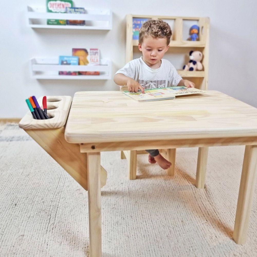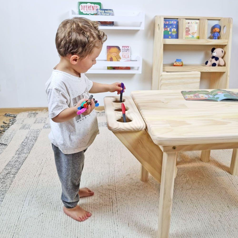 Mesa Infantil Alecrim Em Madeira Cor NaturalSOBRE O PRODUTOOlha só que fofura!! A Mesa Alecrim chegou aqui na Cubomob!Criamos para o seu pequenino uma mesa com suporte para lápis, canetas e demais materiais para que fique tudo bem organizado. Esse suporte pode ser instalado ou não, dependendo da finalidade do uso da mesa.E o melhor, toda sua montagem não necessita de parafusadeira, isso mesmo!! Nós mandamos a chave para a montagem, manual e fica super fácil e prático de montar.ATENÇÃO Por ser de madeira maciça, pode sofrer variação de tonalidades, veios, leves rachaduras e ondulações com o tempo. Porém isso não prejudica o uso. A cor real do produto pode ser diferente da que você está vendo na imagem devido as configurações de calibração de cada monitor. Este produto foi desenvolvido para uso em áreas internas. Deve-se evitar contato com água. Não recomendamos deixar exposta ao sol Conteúdo da embalagem: 1 Mesa Infantil Alecrim Este produto não acompanha a cadeira Foto Ilustrativa: Outros itens não descritos são vendidos separadamente INFORMAÇÕES TÉCNICASAltura 50cm Comprimento 70cm - Com suporte 84cm Profundidade 55cm Peso Suportado 30kg Material Madeira maciça de pinus de reflorestamento. Acabamento Natural: Verniz Incolor Fosco Mel: Tinta Acabamento Necessita Montagem? Mesa desmontada, acompanha manual e ferragens. Ferramenta Necessárias ''Não necessita de parafusadeira, mas caso tenha facilita na fixação do suporte para lápis.''