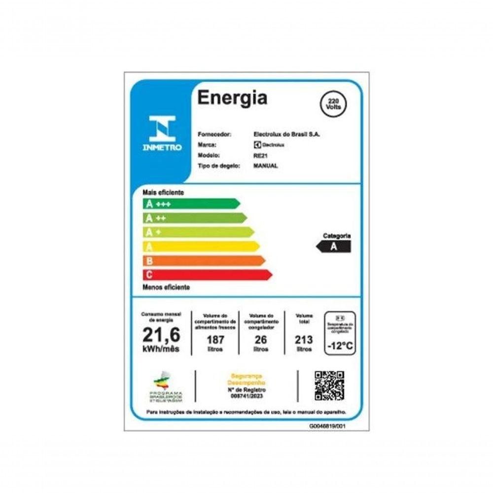 Geladeira Electrolux Uma Porta Com Freezer Duas Estrelas 213L RE21 Branco 110VGeladeira Electrolux 213L 1 Porta com Freezer - Branca (RE21)A Geladeira Electrolux de 213 litros (RE21) é a solução ideal para quem busca eficiência em um design compacto. Perfeita para cozinhas menores, copas ou áreas de lazer, ela oferece organização interna prática com sua gaveta HortiFruti e prateleiras de vidro, além de um freezer para congelar e conservar seus alimentos.Principais Características:Design Compacto com 213L de Capacidade: Suas dimensões compactas permitem que o refrigerador se encaixe perfeitamente em pequenos espaços, sem abrir mão de um bom espaço interno.Freezer Duas Estrelas: O compartimento interno congela e conserva alimentos e bebidas, garantindo mais praticidade para o seu dia a dia.Organização e Praticidade: Conta com uma gaveta HortiFruti dedicada para organizar e visualizar facilmente frutas e vegetais, além de prateleiras de vidro resistentes e fáceis de limpar.Iluminação LED e Gás Ecológico: A iluminação em LED oferece uma ótima visualização interna com baixo consumo de energia. O gás R600a não agride o meio ambiente nem a camada de ozônio.Especificações Técnicas:Marca: ElectroluxModelo: RE21Voltagem: 110VTipo: Refrigerador 1 PortaCapacidade Total: 213 LitrosTipo de Degelo: Cycle DefrostClassificação Energética: AConsumo de Energia: 24,9 kWh/mêsCor: BrancoPeso: 39,5 kgDimensões [AxLxP]: 141,6 x 55 x 61,3 cmGarantia: 12 meses