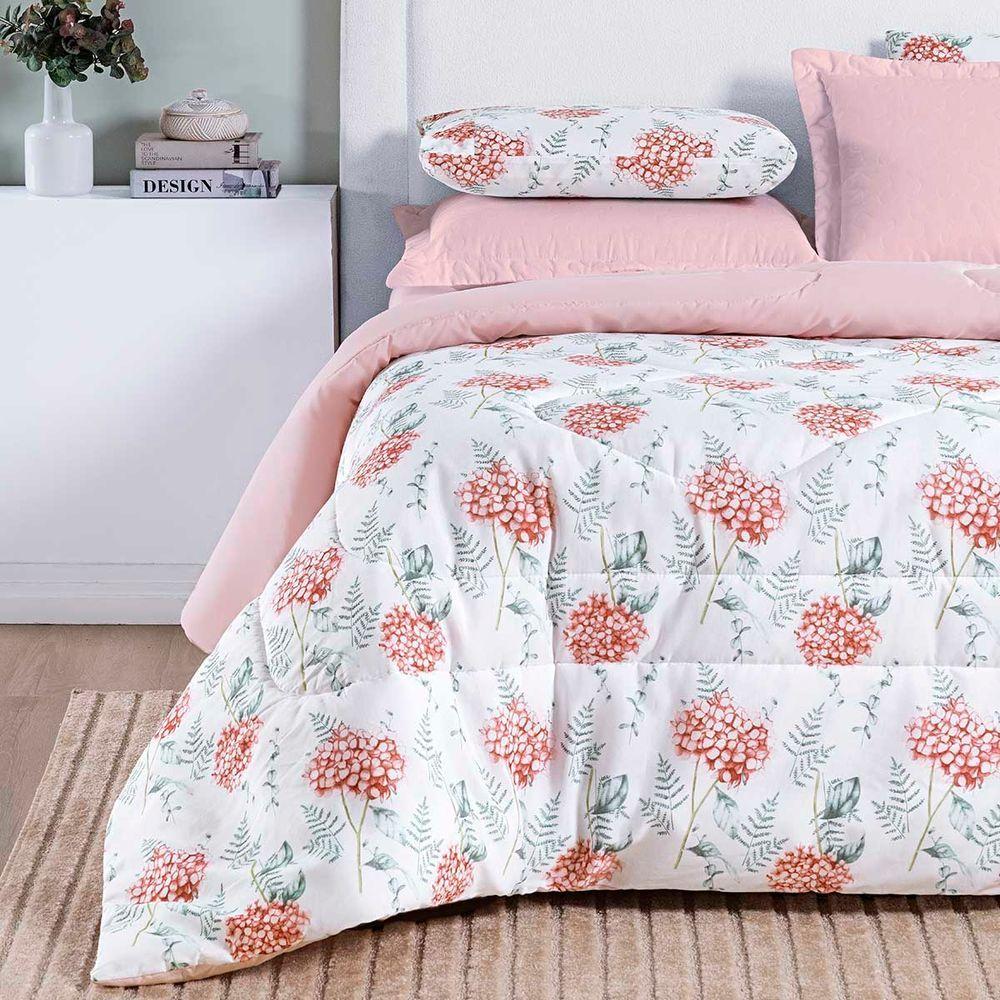 Edredom Cobertor Casa Scarpa Maris Super King Percalle 200 Fios Estampado Floral Hortênsia Salmão