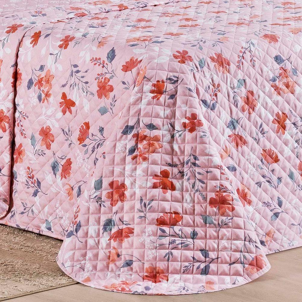 Kit Cobre Leito Colcha Belle Queen Estampado Dupla Face 400 Fios 3 Peças Floral Rosê