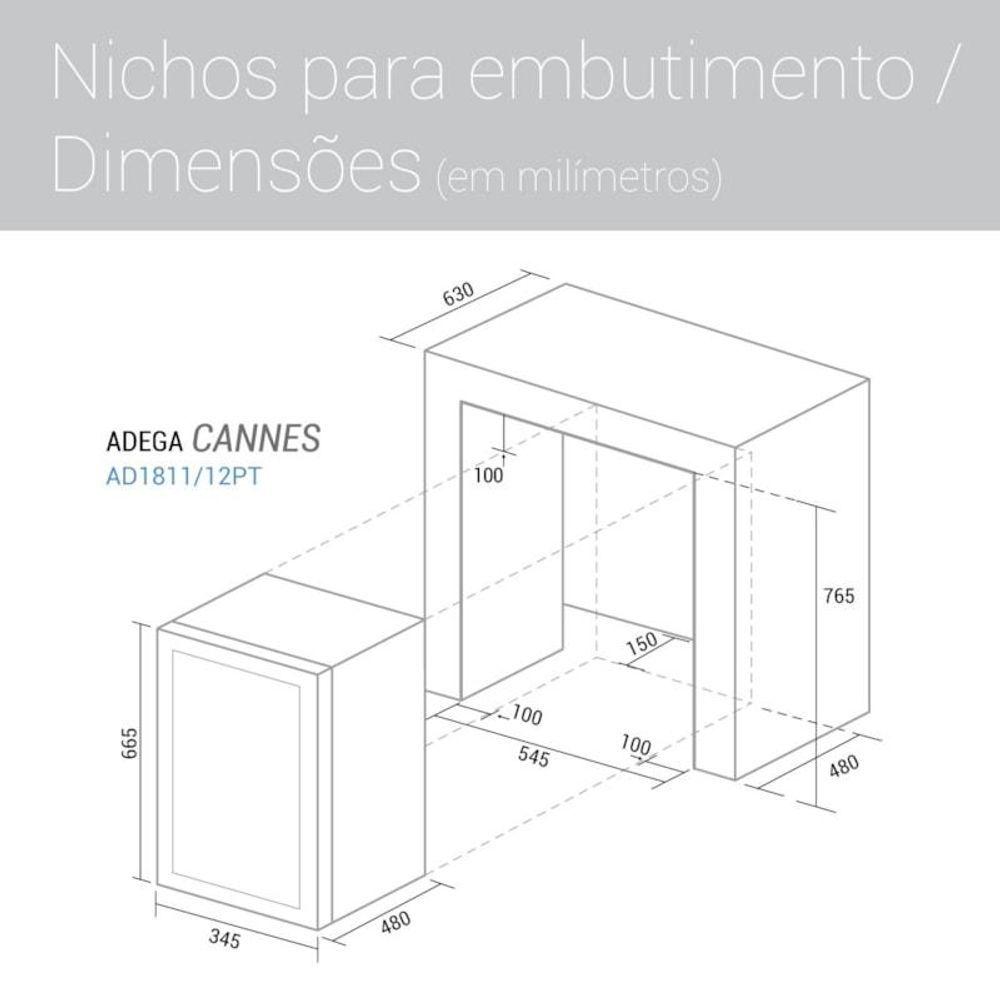 Adega Climatizada Cannes 18 Garrafas Preta Suggar 110VBons momentos ficam ainda melhores acompanhados de um bom vinho. Conheça a Adega Cannes Suggar.Mais espaço e comodidade para armazenar até 18 garrafas.Possui porta espelhada com vidro duplo e painel digital sensível ao toque para o controle preciso da temperatura.Tudo isso para deixar suas bebidas na temperatura ideal e seus momentos muito mais especiais.Conta ainda com painel digital externo para controlar a temperatura e iluminação interna com LEDs, que preserva as propriedades dos rótulos.Vantagens do ProdutoControle de temperatura digitalAusência de vibraçõesFácil instalaçãoSistema eletrônico de refrigeraçãoIluminação interna com LEDsPorta com vidro duploPara vinhos e champanhePotência: 85WMedidas do ProdutoProduto / Com embalagem / Para embutirAltura: 66,5 cmLargura: 34,5 cmProfundidade: 48,0 cmPeso: 16,0 kgEspecificações TécnicasNome do produto: Adega Climatizada Cannes 18 garrafasCor: PretaModelo 127V: AD1811PTCódigo EAN 127V: Modelo 220V: AD1822PTCódigo EAN 220V: Quantidade por caixa: 1Voltagem: 127V