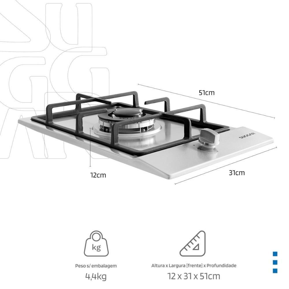 Cooktop A Gás 1B Inox BivoltPotência e Praticidade para sua CozinhaDescubra o Cooktop Suggar Inox 1 Queimador Tripla Chama, a solução perfeita para quem valoriza eficiência e estilo na cozinha. Com um queimador de tripla chama de 3,2 kW, você prepara suas receitas com rapidez e potência, tornando o dia a dia muito mais prático.A mesa em aço inox e as trempes de ferro fundido garantem não apenas robustez, mas também um design moderno que se adapta a qualquer ambiente. Compacto e versátil, este cooktop é ideal para cozinhas pequenas e áreas gourmet, além de ser um excelente apoio para grandes preparos.Vantagens do Cooktop Suggar Inox 1 QueimadorAcendimento superautomático: maior praticidade no preparo das refeições.Queimador tripla chama central: mais potência e rapidez no preparo dos pratos.Trempes de ferro fundido: modernas, robustas e duráveis.Mesa em inox: qualidade e alta resistência.Botão multicontrol removível: facilita ainda mais a limpeza no dia a dia.Bivolt: compatível com diferentes tensões.1 queimador a gás: ideal para quem busca eficiência.Potência: 3,2 kW.Medidas do ProdutoAltura: 12,0 cmLargura: 31,0 cmProfundidade: 51,0 cmPeso: 4,4 kgEspecificações TécnicasNome do produto: Cooktop inox 1 queimadorCor: InoxModelo Bivolt: FG1002IXCódigo EAN: 789.831.282.213-2Qtd. pçs. caixa: 1Perguntas FrequentesQual a potência do queimador do Cooktop Suggar Inox 1 Queimador?O modelo conta com queimador tripla chama de 3,2 kW, garantindo rapidez e potência no preparo das receitas.O Cooktop Suggar Inox 1 Queimador é resistente?Sim. Ele possui mesa em aço inox de alta resistência e trempe em ferro fundido, que oferecem robustez e durabilidade.O acendimento do Cooktop Suggar Inox 1 Queimador é automático?Sim. O modelo possui acendimento superautomático: basta girar o botão para que a chama seja acesa de forma prática e segura.O Cooktop Suggar Inox 1 Queimador é compacto?Sim. Suas dimensões de 31 x 12 x 51 cm e peso reduzido tornam o produto ideal para cozinhas pequenas, áreas gourmet e como apoio em grandes preparos.O Cooktop Suggar Inox 1 Queimador pode ser usado em GLP e GN?Sim. Ele é compatível com GLP e pode ser convertido para GN mediante ajuste técnico, oferecendo maior versatilidade de instalação.Dados GeraisGarantia: 12 MesesMarca: SuggarModelo: FG1002IXCor: InoxTipo de montagem: EmbutirFabricante: SuggarQuantidade de queimadores: 1Voltagem: Bivolt