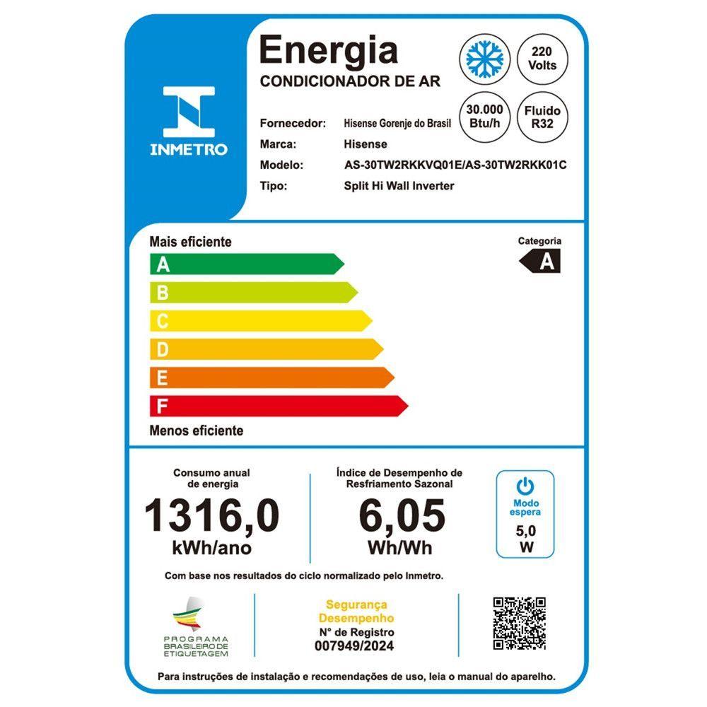 Ar Condicionado As30tw2rkk Inverter Wi Fi 30000 Btus Hisense Branco 220vA Hisense, com mais de 55 anos de experiencia em novas tecnologia, foi pioneira no desenvolvimento do sistema inverter na china.Oferecendo maxima eficiencia energetica e conforto incomparavel, nossos produtos garantem desempenho superior em toda a linha.Escolha Hisense para inovacao e qualidade no seu ar-condicionado.Experimente o futuro do conforto com a Evaporadora AS30TW2RKKVQ01E Split Hi WalI Inverter Hisense.Caracteristicas:Marca: HisenseModelo: AS30TW2RKKVQ01ENivel de Ruido: 19dBConectividade com Aplicativos: ConnectLife, Assistant e Painel: Display no Painel Frontal/LED/Visor OcultoTipos de Velocidades: Mais Alta, Alta, Media, Baixa, Mais Baixa.Funcoes: Swing, Cool(Arrefecimento)/Dry (Seco)/Fan (Ventilacao)/Hot (Aquecimento)Eco (Economia de Energia) /Super (Aumenta o fluxo de ar), Modo Dry, Modo Sleep, Auto Clean,Auto Restart, Auto diagnosticoConteudo da Embalagem:01 Evaporadora AS30TW2RKKVQ01E Split Hi WalI Inverter Wi fi BTUs Frio HisenseDimensoes:Altura: 36,4 cmLargura: 135 cmProfundidade: 26,3 cmPeso: 17,5 KgCaracteristicas:Marca: HisenseModelo: AS30TW2RKK01CClassificacao do INMETRO: Categoria AFluido Refrigerante: R32Capacidade Maxima de Refrigeracao: 31322,16 (Btu/h)Consumo: 1316 kWh/AnoFrequencia: 60HzPotencia Eletrica Consumida: 2554WConteudo da Embalagem:01 Condensadora AS30TW2RKK01C Split Hi Wall Inverter Wi Fi 30000 Btus Frio HisenseDimensoes:Altura: 75 cmLargura: 90 cmProfundidade: 34 cmPeso: 49 KgGarantia do Fornecedor: 12 meses (Contra de fabricacao a contar do momento da emissao da ).