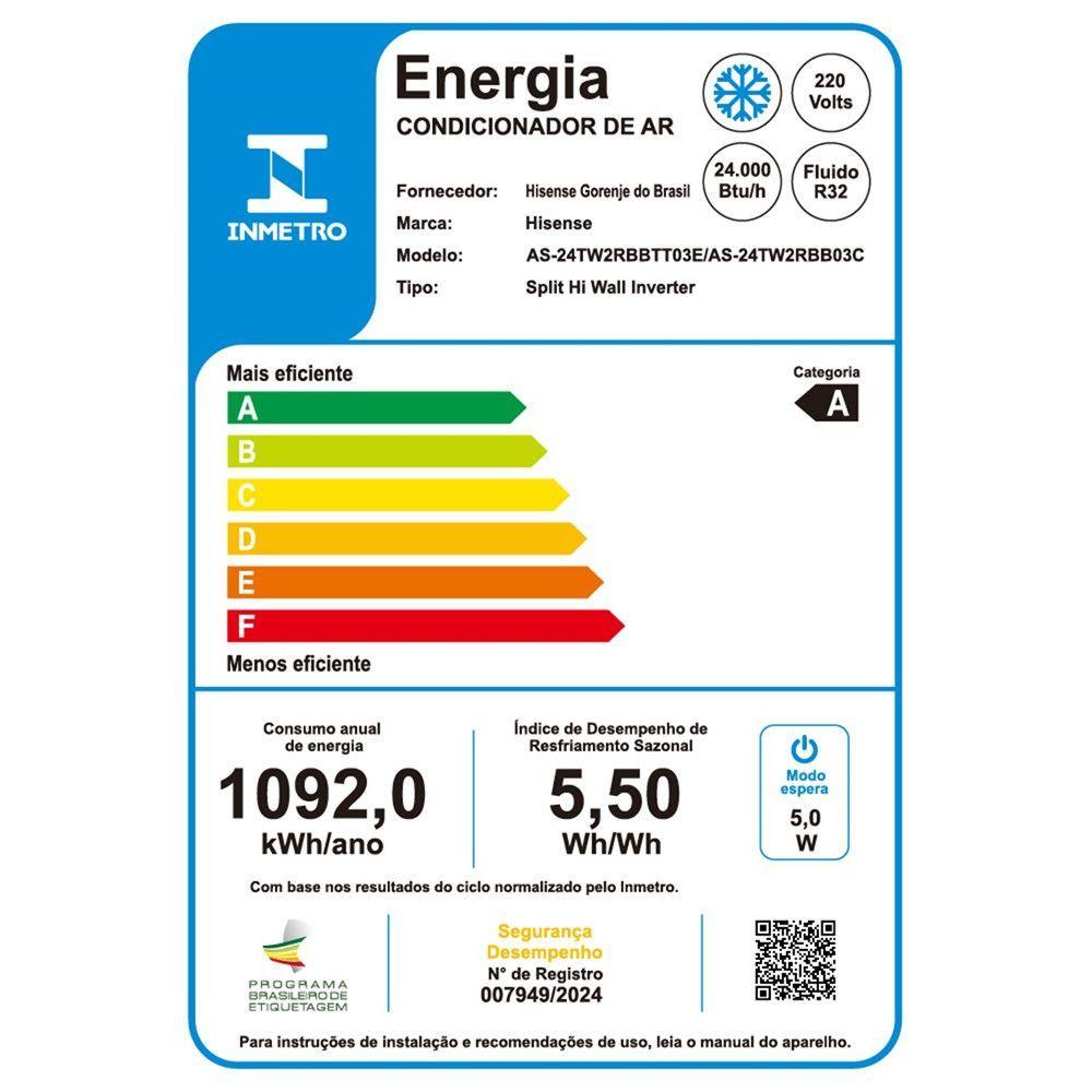 Ar Condicionado Hisense Inverter Wi Fi 24.000 BTUs Frio Branco AS24TW2RBB 220VA Hisense, com mais de 55 anos de experiencia em novas tecnologia, foi pioneira no desenvolvimento do sistema inverter na china.Oferecendo maxima eficiencia energetica e conforto incomparavel, nossos produtos garantem desempenho superior em toda a linha.Escolha Hisense para inovacao e qualidade no seu ar-condicionado.Experimente o futuro do conforto com o Ar Condicionado Split Hi Wall Inverter Hisense.Com tecnologia inverter, que reduz ate 80 o consumo de energia.A Condensadora super resistente com estrutura de metal, 10 anos de garantia no compressor inverter e protecao contra insetos e corrosao.Caracteristicas:Marca: HisenseModelo: AS24TW2RBB03CFluido Refrigerante: R32Classificacao do INMETRO: ACapacidade Maxima de Refrigeracao: 24245 (Btu/h)Consumo: 1092kWh/AnoFrequencia: 60HzPotencia Eletrica Consumida: 2258WConteudo da Embalagem:01 Condensadora AS24TW2RBB03C Split Hi Wall Inverter WiFi 24000 btus Frio HisenseDimensoes:Altura: 65 cmLargura: 86 cmProfundidade: 31 cmPeso: 39 KgCaracteristicas:Marca: HisenseModelo: AS24TW2RBBTT03ENivel de Ruido: 19dBPainel: Display no Painel Frontal/LED/Visor OcultoTipos de Velocidades: Mais Alta, Alta, Media, Baixa, Mais Baixa.Funcoes: Swing, Cool (Arrefecimento)/Dry (Seco)/Fan(Ventilacao)/Hot (Aquecimento)Eco (Economia de Energia)/Super (Aumenta o fluxo de ar)Modos: Modo Dry, Modo Sleep, Modo Resfriamento RapidoFuncoes Automaticas: Auto Clean, Auto Restart, Auto diagnosticoConteudo da Embalagem:01 Evaporadora AS24TW2RBBTT03E Split Hi Wall Inverter Wi Fi 24.000 BTUs Frio HisenseDimensoes:Altura: 31,5 cmLargura: 108,5 cmProfundidade: 23,5 cmPeso: 14 KgGarantia do Fornecedor: 12 meses (Contra defeito de fabricacao a contar do momento da emissao da Nota Fiscal).