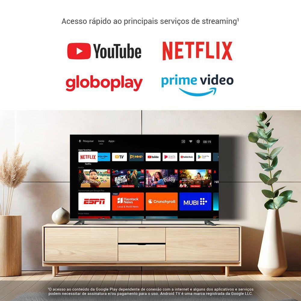 Smart Tv 50 Polegadas P50eaa 4k Led Android 11 Dolby Audio Cinza BivoltPrincipais Caracteristicas ComerciaisAndroid TVBorda InfinitaImagens 4K vividas e detalhadasSistema Android TV com recursos intuitivos e tecnologicosBorda infinita que proporciona imersaoChromecast built-in para transmitir conteudos do celularGoogle Assistente para pesquisas por vozFast Smart TV com resposta 50 mais rapidaFuncionalidadesSmart TV: SimLoja de aplicativos: SimFuncoes gamer: NaoBluetooth: Sim, versao 5.1Espelhamento de tela: ChromecastNavegador: SimConexao com Alexa: NaoConexao com Google Assistente: SimAplicativos pre-instalados: Netflix, Prime Video, Apple TV, Disney+, YouTubeTamanho da tela: 50 polegadasResolucao: UHD (3840x2160)Formato: 16:09HDR: HDR10Recepcao ATV/DTV/CATV: SimDolby Vision / Atmos / Audio: Dolby AudioTipo de painel: DLEDFrequencia: 60HzAngulo de visao: 170 x 170Padroes de imagem: PAL-M, PAL-N, NTSCSuperficie da tela: Plana, brilhanteTempo de resposta: 8msDolby Audio: SimDolby Atmos: NaoCanais: 2.0Audio Surround: SimEqualizador: SimPotencia total: 2 x 12W RMSAudio Bluetooth: Sim, transmissorHDMI: 3 entradas HDMI 2.1USB: 2 entradas USB 2.0Saida para fone de ouvido: NaoEntrada RCA: NaoEntrada LAN (RJ-45): SimEntrada RF: SimSaida digital optica: SimItens Inclusos:Controle remoto com vozCabo de forcaManual de instrucoesBase + parafusosModelo: TV P50EAASistema operacional: Android 11Processador: Quad-coreConversor digital integrado: SimConsumo medio: 72,2 WRecursosMute, MTS, Sleep, Closed Caption, DNR, Guide, Info, Bloqueio de canal, Relogio, Zoom, PVR, HDMI ARC, T-Link, Ajustes e ConfiguracoesFuracao VESA: 200 x 200Contraste dinamico: 5.000.000:1Brilho: 250 cd/m²Menu multi-idiomasBusca automatica de canaisEqualizador de som e imagemAjuste de temperatura de corTransmissao ISDB-THDMI: Conexao digital de audio e videoSleep Timer: Desliga automaticamenteGuide: Guia de programacaoInfo: Informacoes do programaDNR: Reducao de ruidoClosed Caption: Legendas do audio originalSAP/MTS: Alternancia entre audios disponiveisHDR: Alto alcance dinamicoCor do produto: Space GrayCor da base: PretoMaterial: Painel traseiro de metal, tampa plastica e frontal plasticoCapacidade interna total/util: 8GBTamanho do cabo: 1,5mTomada: 10APinos: 2Tipo de painel: VAN Desenho: 15958-00-00Potencia: 72,2 WConsumo: 8,87 kWh/mesCodigo de barras: 7891356123832Origem: ManausIPI: IsentoCodigo AnatelAL-7663B-WG-A - 09804-22-11928CRATV02IRBT - 01413-24-12025Dimensoes Com Base:Altura: 69,1 cmLargura: 111 cmProfundidade: 25,5 cmDimensoes Sem Base:Altura: 64,3 cmLargura: 111 cmProfundidade: 7,5 cmGarantia do Fornecedor: 12 Meses.